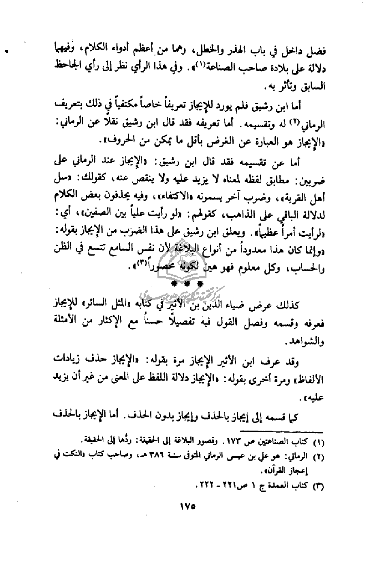 أما ابن رشيق فلم يورد للإيجاز تعريفا خاصا مكتفيا في ذلك بتعريف الرماني (¬2) له وتقسيمه. أما تعريفه فقد قال ابن رشيق نقلا عن الرماني: