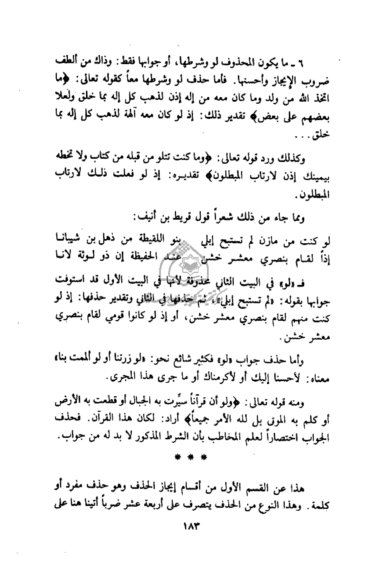 6 - ما يكون المحذوف لو وشرطها، أو جوابها فقط: وذاك من ألطف ضروب الإيجاز وأحسنها. فأما حذف لو وشرطها معا كقوله تعالى: مَا اتَّخَذَ اللَّهُ مِنْ وَلَدٍ وَما كانَ مَعَهُ مِنْ إِلهٍ إذن لَذَهَبَ كُلُّ إِلهٍ بِما خَلَقَ وَلَعَلا بَعْضُهُمْ عَلى بَعْضٍ تقدير ذلك: إذ لو كان معه آلهة لذهب كل إله بما خلق ...