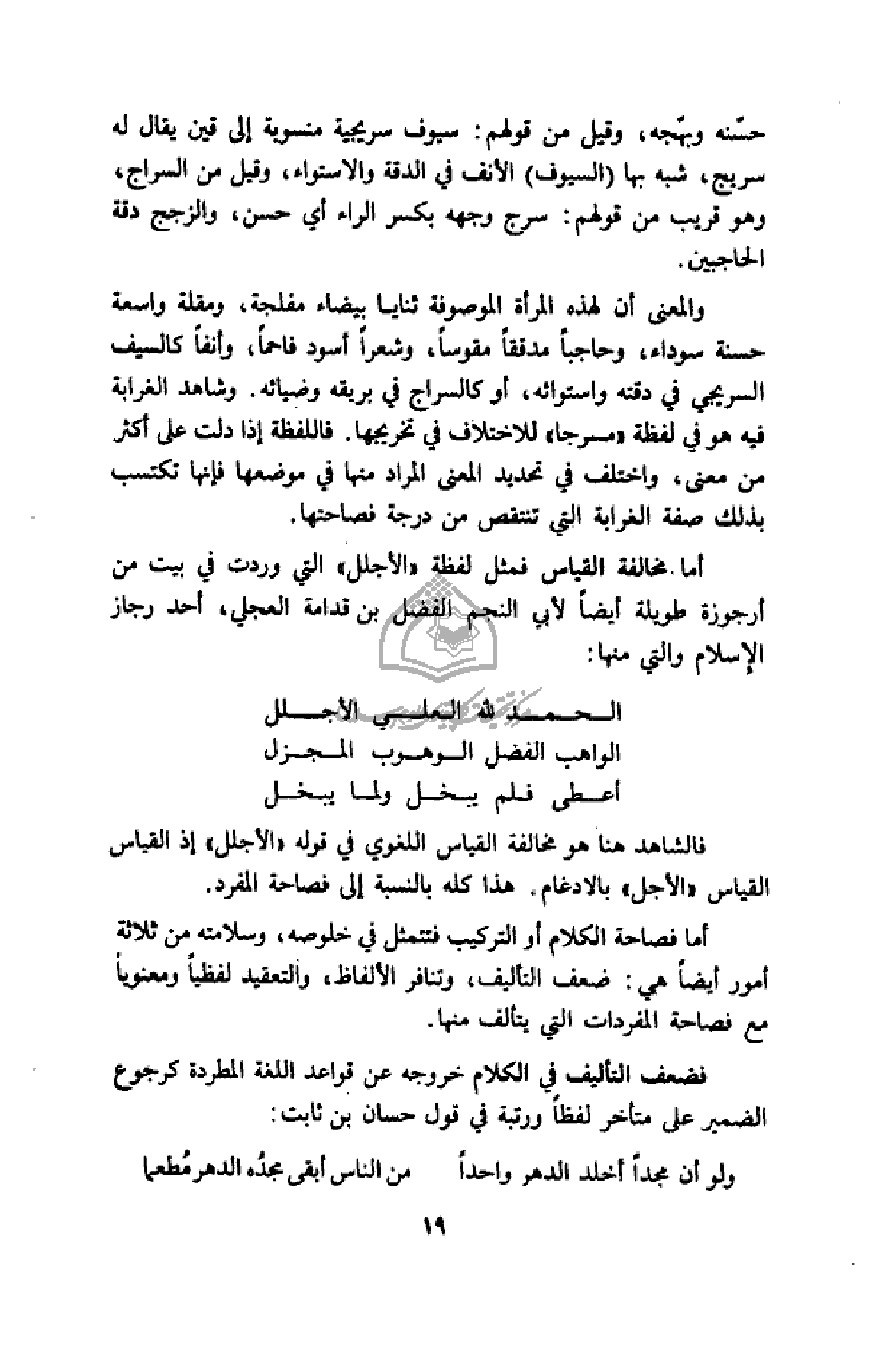 وشعرا أسود فاحما، وأنفا كالسيف السريجي في دقته واستوائه، أو كالسراج في بريقه وضيائه. وشاهد الغرابة فيه هو في لفظة «مسرجا» للاختلاف في تخريجها. فاللفظة إذا دلت على أكثر من معنى، واختلف في تحديد المعنى المراد منها في موضعها فإنها تكتسب بذلك صفة الغرابة التي تنتقص من درجة فصاحتها.
