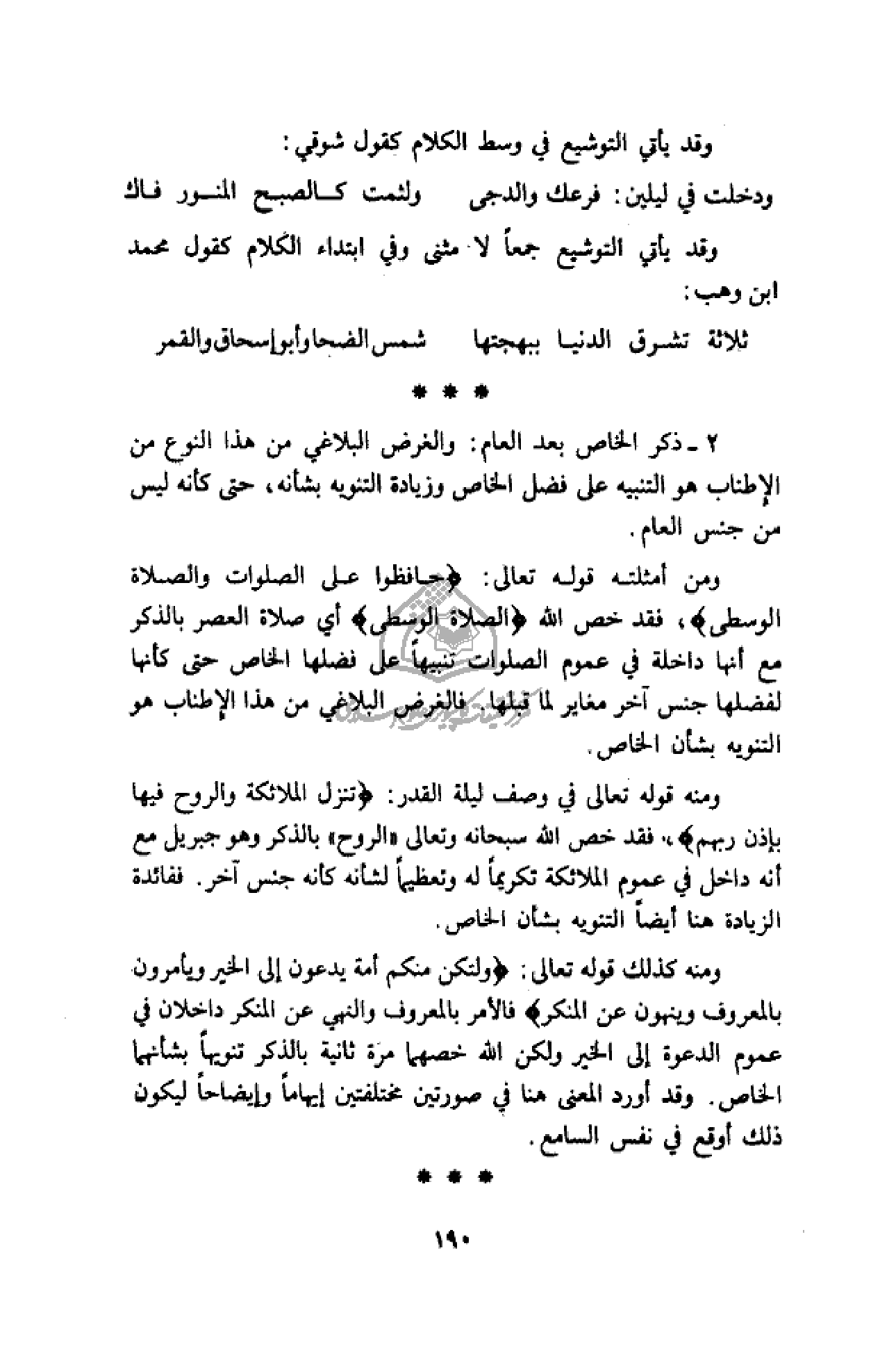 ومنه كذلك قوله تعالى: وَلْتَكُنْ مِنْكُمْ أُمَّةٌ يَدْعُونَ إِلَى الْخَيْرِ وَيَأْمُرُونَ بِالْمَعْرُوفِ وَيَنْهَوْنَ عَنِ الْمُنْكَرِ فالأمر بالمعروف والنهي عن المنكر داخلان في عموم الدعوة إلى الخير ولكن الله خصهما مرة ثانية بالذكر تنويها بشأنهما الخاص. وقد أورد المعنى هنا في صورتين مختلفتين إيهاما وإيضاحا ليكون ذلك أوقع في نفس السامع.