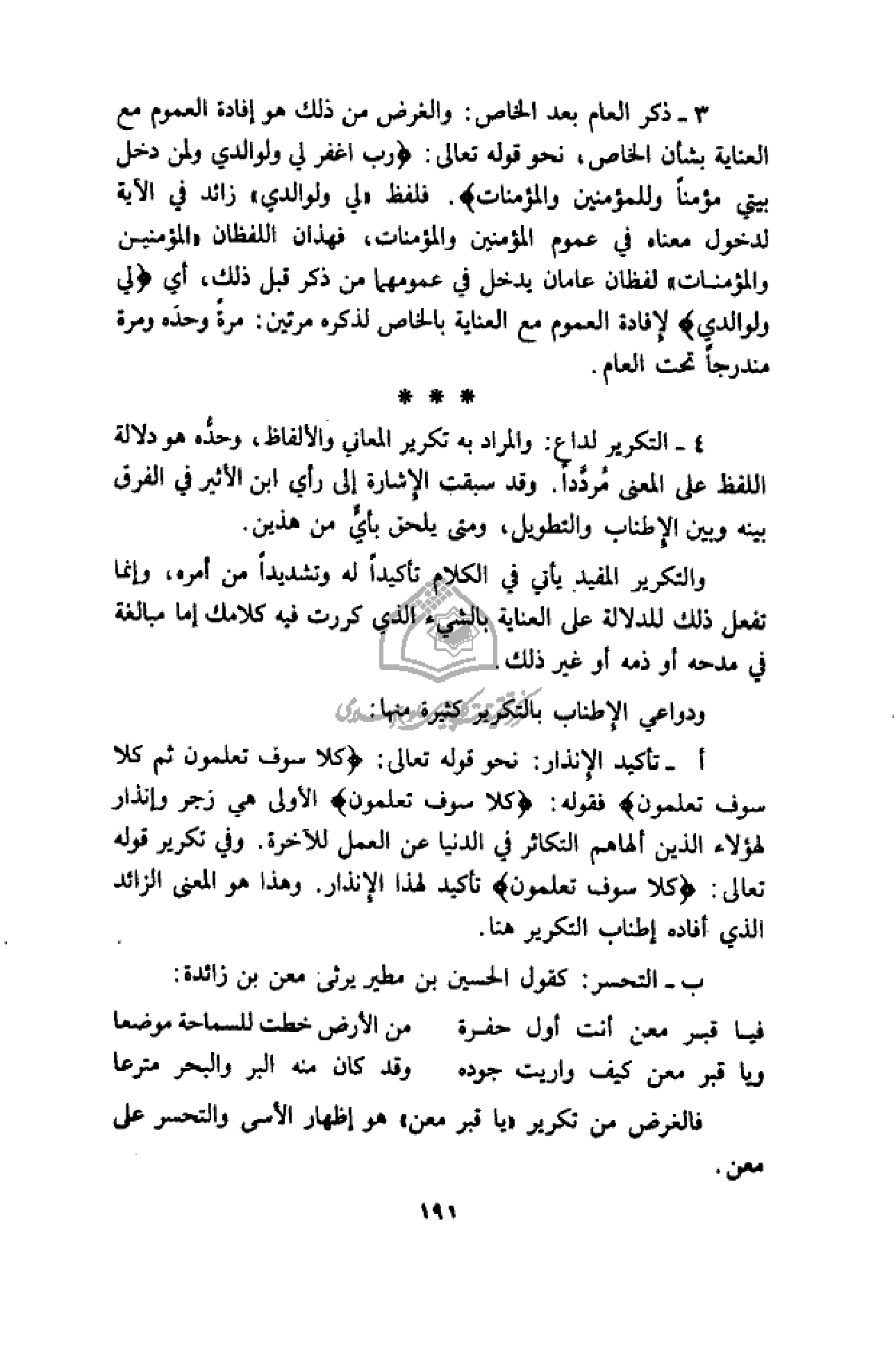 والغرض من ذلك هو إفادة العموم مع العناية بشأن الخاص، نحو قوله تعالى: رَبِّ اغْفِرْ لِي وَلِوالِدَيَّ وَلِمَنْ دَخَلَ بَيْتِيَ مُؤْمِناً وَلِلْمُؤْمِنِينَ وَالْمُؤْمِناتِ. فلفظ «لي ولوالدي» زائد في الآية لدخول معناه في عموم المؤمنين والمؤمنات، فهذان اللفظان «المؤمنين والمؤمنات» لفظان عامان يدخل في عمومهما من ذكر قبل ذلك، أي لِي وَلِوالِدَيَّ لإفادة العموم مع العناية بالخاص لذكره مرتين: مرة وحده ومرة مندرجا تحت العام.