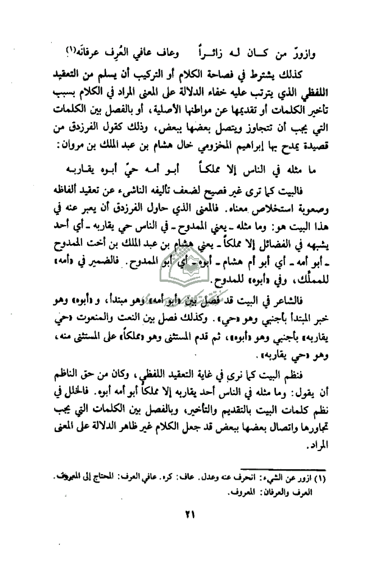 فالبيت كما ترى غير فصيح لضعف تأليفه الناشئ عن تعقيد ألفاظه وصعوبة استخلاص معناه. فالمعنى الذي حاول الفرزدق أن يعبر عنه في هذا البيت هو: وما مثله- يعني الممدوح- في الناس حي يقاربه- أي أحد يشبهه في الفضائل إلا مملكا- يعني هشام بن عبد الملك بن أخت الممدوح- أبو أمه- أي أبو أم هشام- أبوه- أي أبو الممدوح. فالضمير في «أمه» للمملّك، وفي «أبوه» للمدوح.