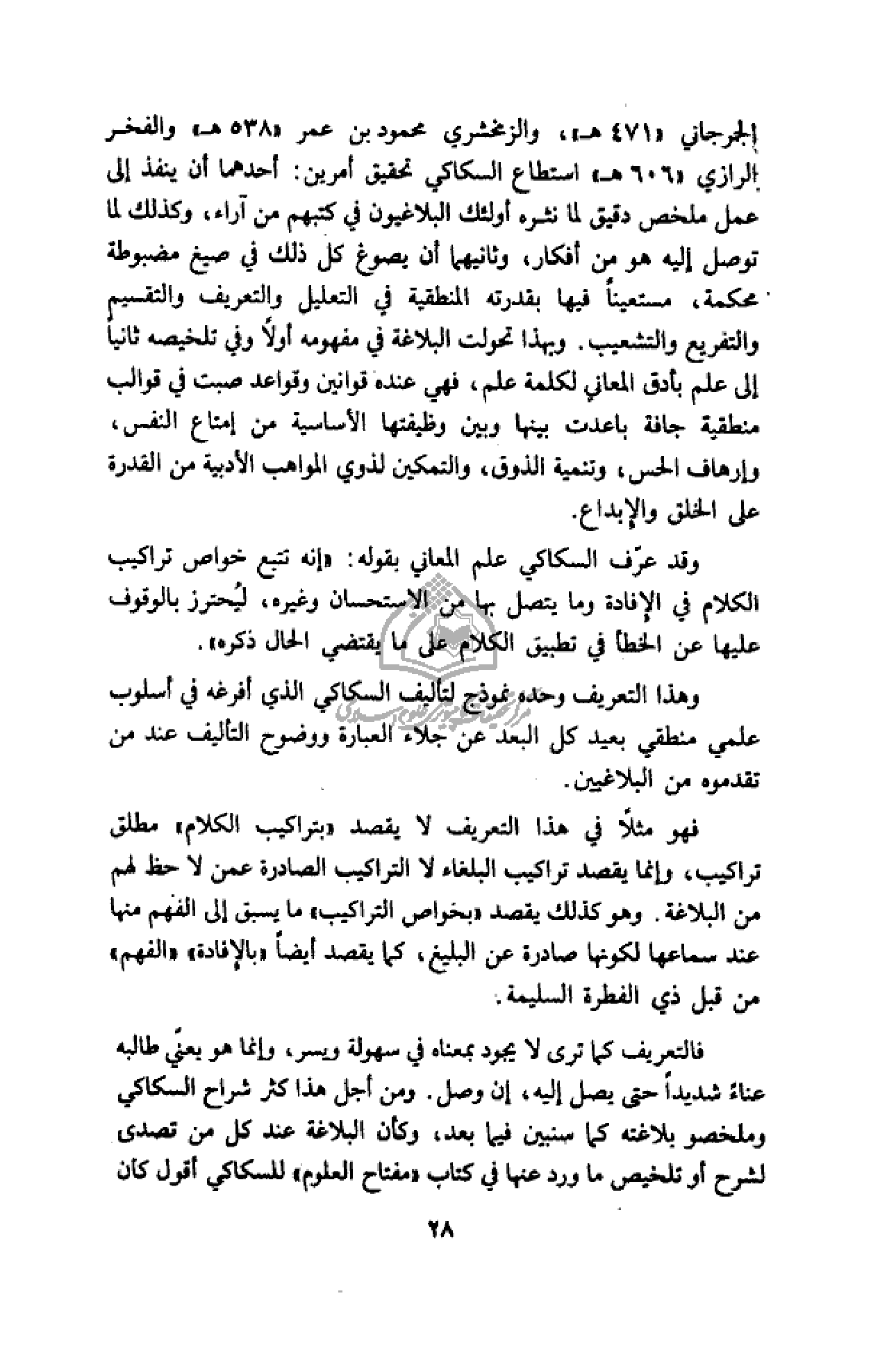 فالتعريف كما ترى لا يجود بمعناه في سهولة ويسر، وإنما هو بعنّي طالبه عناء شديدا حتى يصل إليه، إن وصل. ومن أجل هذا كثر شراح السكاكي وملخصو بلاغته كما سنبين فيما بعد، وكأن البلاغة عند كل من تصدى لشرح أو تلخيص ما ورد عنها في كتاب «مفتاح العلوم» للسكاكي أقول كان