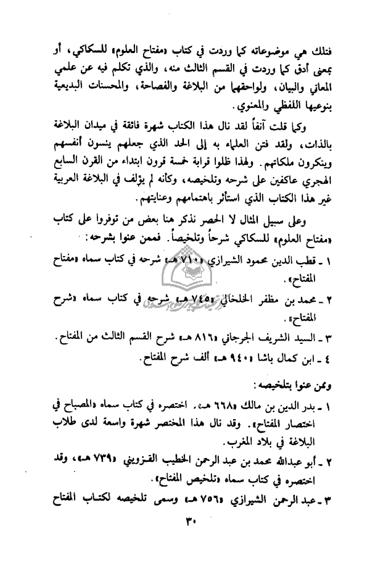 وعلى سبيل المثال لا الحصر نذكر هنا بعض من توفروا على كتاب «مفتاح العلوم» للسكاكي شرحا وتلخيصا. فممن عنوا بشرحه: