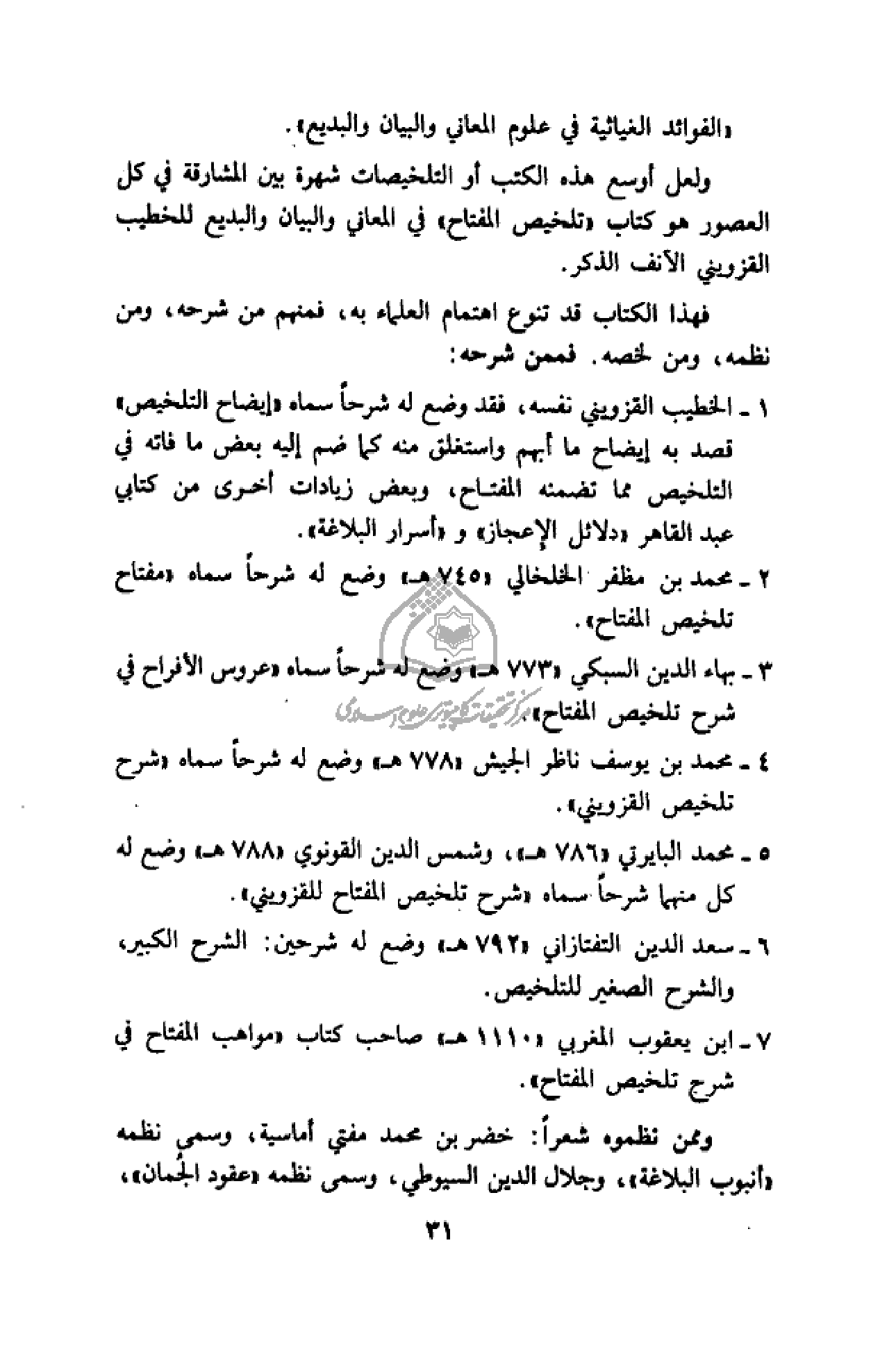 6 - سعد الدين التفتازاني «792 هـ» وضع له شرحين: الشرح الكبير، والشرح الصغير للتلخيص.