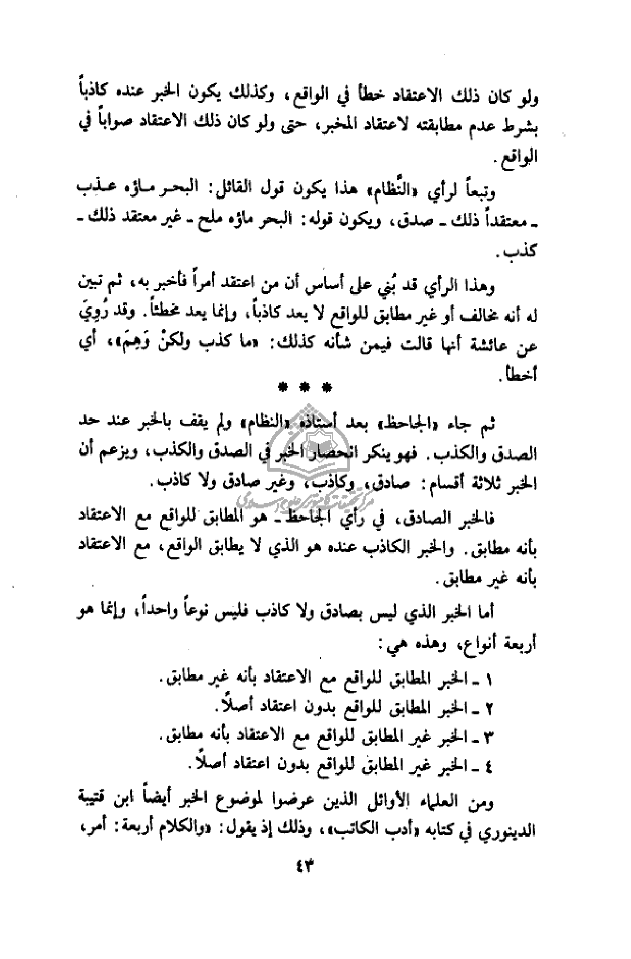 ثم جاء «الجاحظ» بعد أستاذه «النظام» ولم يقف بالخبر عند حد الصدق والكذب. فهو ينكر انحصار الخبر في الصدق والكذب، ويزعم أن الخبر ثلاثة أقسام: صادق، وكاذب، وغير صادق ولا كاذب.