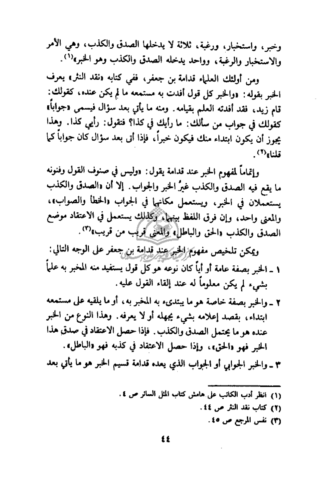 ومن أولئك العلماء قدامة بن جعفر، ففي كتابه «نقد النثر» يعرف الخبر بقوله: «والخبر كل قول أفدت به مستمعه ما لم يكن عنده، كقولك