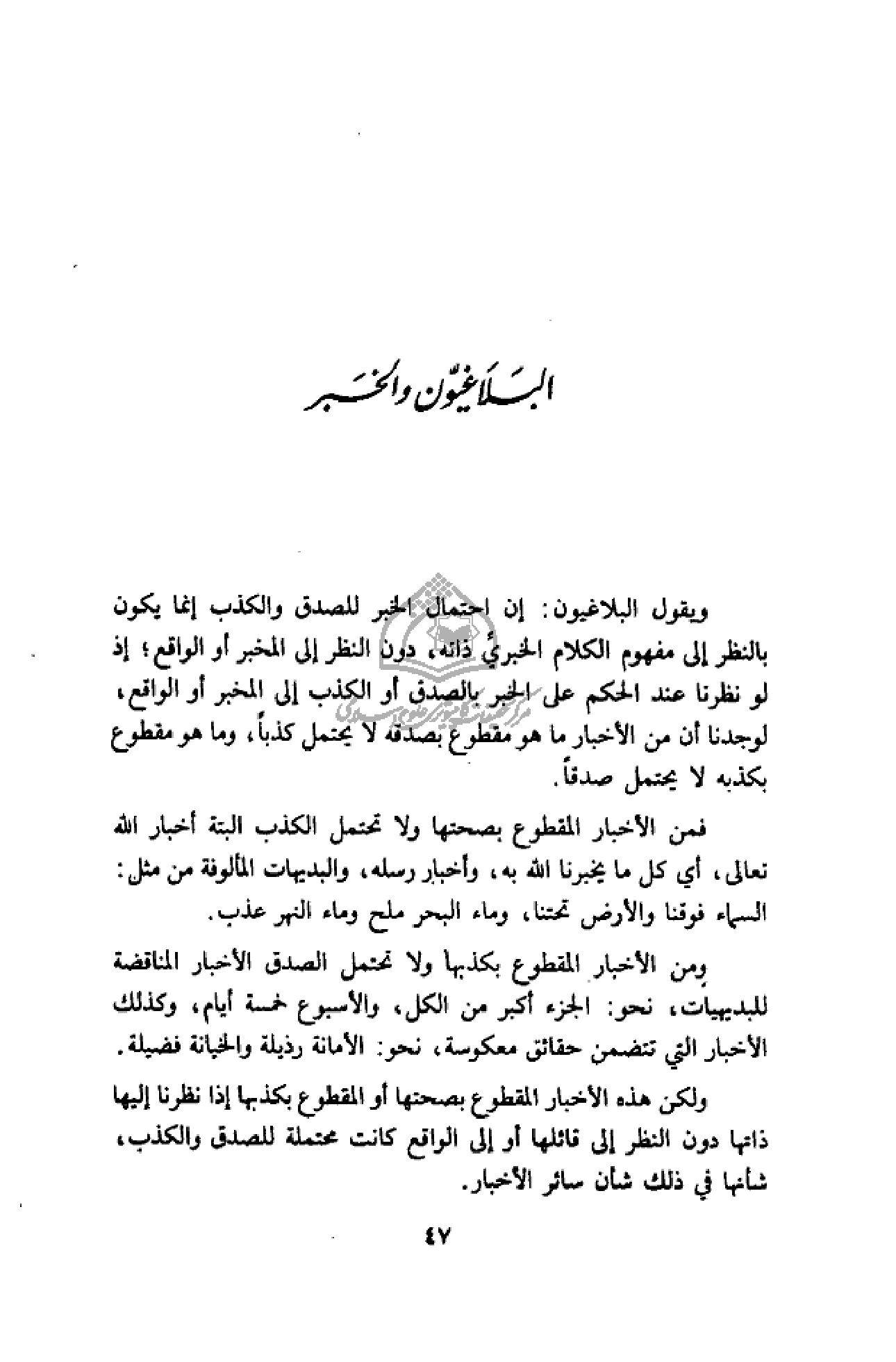 ويقول البلاغيون: إن احتمال الخبر للصدق والكذب إنما يكون بالنظر إلى مفهوم الكلام الخبريّ ذاته، دون النظر إلى الخبر أو الواقع؛ إذ لو نظرنا عند الحكم على الخبر بالصدق أو الكذب إلى الخبر أو الواقع، لوجدنا أن من الأخبار ما هو مقطوع بصدقه لا يحتمل كذبا، وما هو مقطوع بكذبه لا يحتمل صدقا.