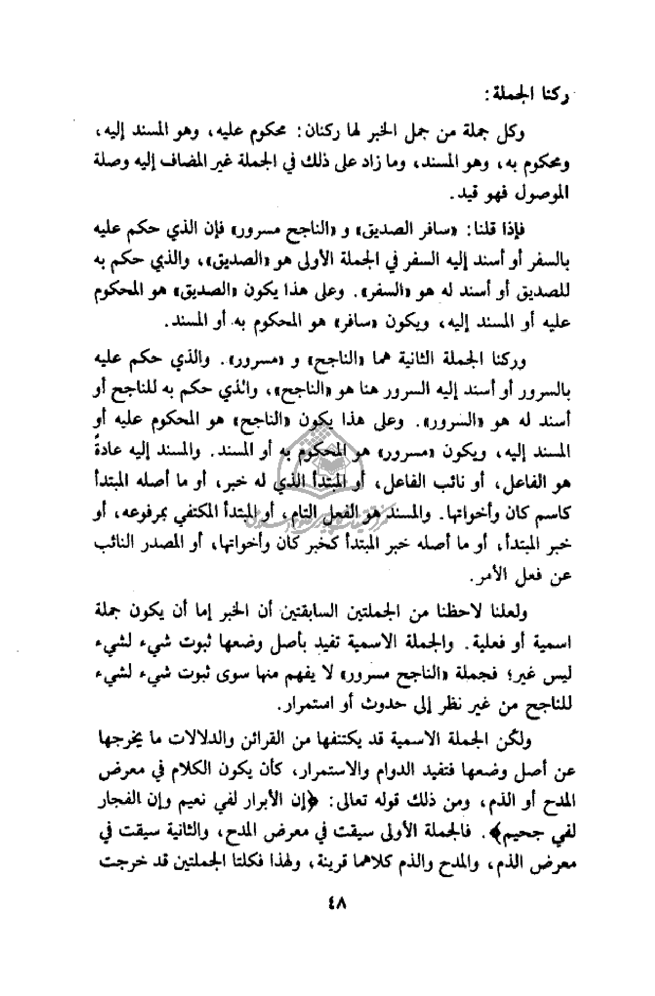 وركنا الجملة الثانية هما «الناجح» و «مسرور». والذي حكم عليه بالسرور أو أسند إليه السرور هنا هو «الناجح»، والذي حكم به للناجح أو أسند له هو «السرور». وعلى هذا يكون «الناجح» هو المحكوم عليه أو المسند إليه، ويكون «مسرور» هو المحكوم به أو المسند. والمسند إليه عادة هو الفاعل، أو نائب الفاعل، أو المبتدأ الذي له خبر، أو ما أصله المبتدأ كاسم كان وأخواتها. والمسند هو الفعل التام، أو المبتدأ المكتفي بمرفوعه، أو خبر المبتدأ، أو ما أصله خبر المبتدأ كخبر كان وأخواتها، أو المصدر النائب عن فعل الأمر.