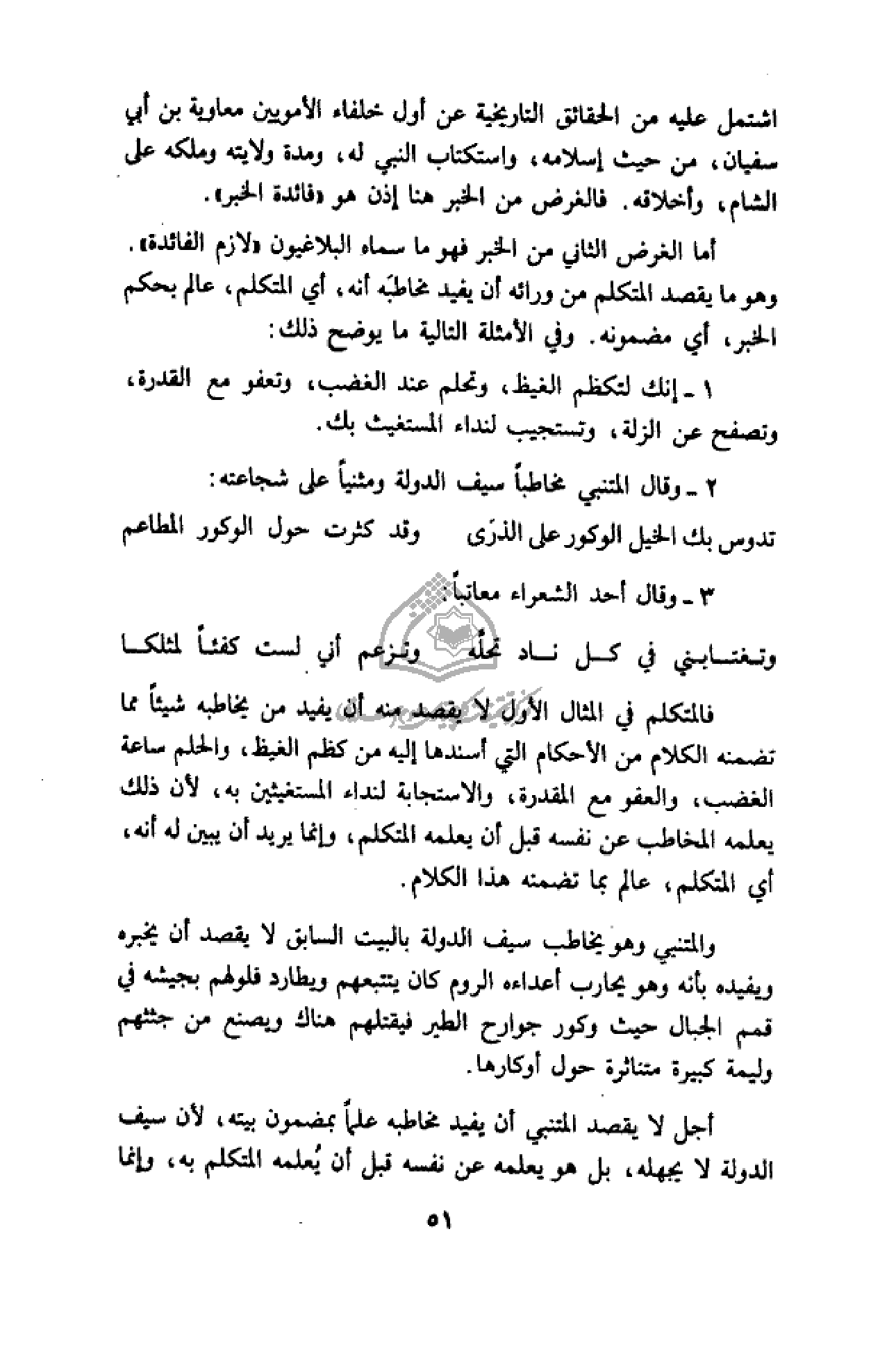 فالمتكلم في المثال الأول لا يقصد منه أن يفيد من يخاطبه شيئا مما تضمنه الكلام من الأحكام التي أسندها إليه من كظم الغيظ، والحلم ساعة الغضب، والعفو مع المقدرة، والاستجابة لنداء المستغيثين به، لأن ذلك يعلمه المخاطب عن نفسه قبل أن يعلمه المتكلم، وإنما يريد أن يبين له أنه، أي المتكلم، عالم بما تضمنه هذا الكلام.