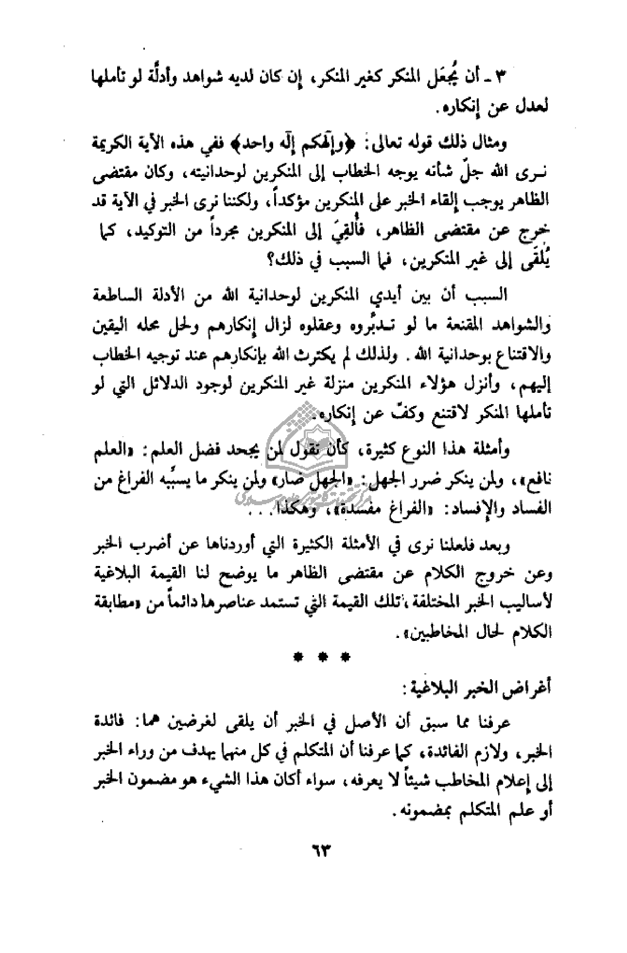 ومثال ذلك قوله تعالى: وَإِلهُكُمْ إِلهٌ واحِدٌ ففي هذه الآية الكريمة نرى الله جلّ شأنه يوجه الخطاب إلى المنكرين لوحدانيته، وكان مقتضى الظاهر يوجب إلقاء الخبر على المنكرين مؤكدا، ولكننا نرى الخبر في الآية قد خرج عن مقتضى الظاهر، فألقي إلى المنكرين مجردا من التوكيد، كما يلقى إلى غير المنكرين، فما السبب في ذلك؟