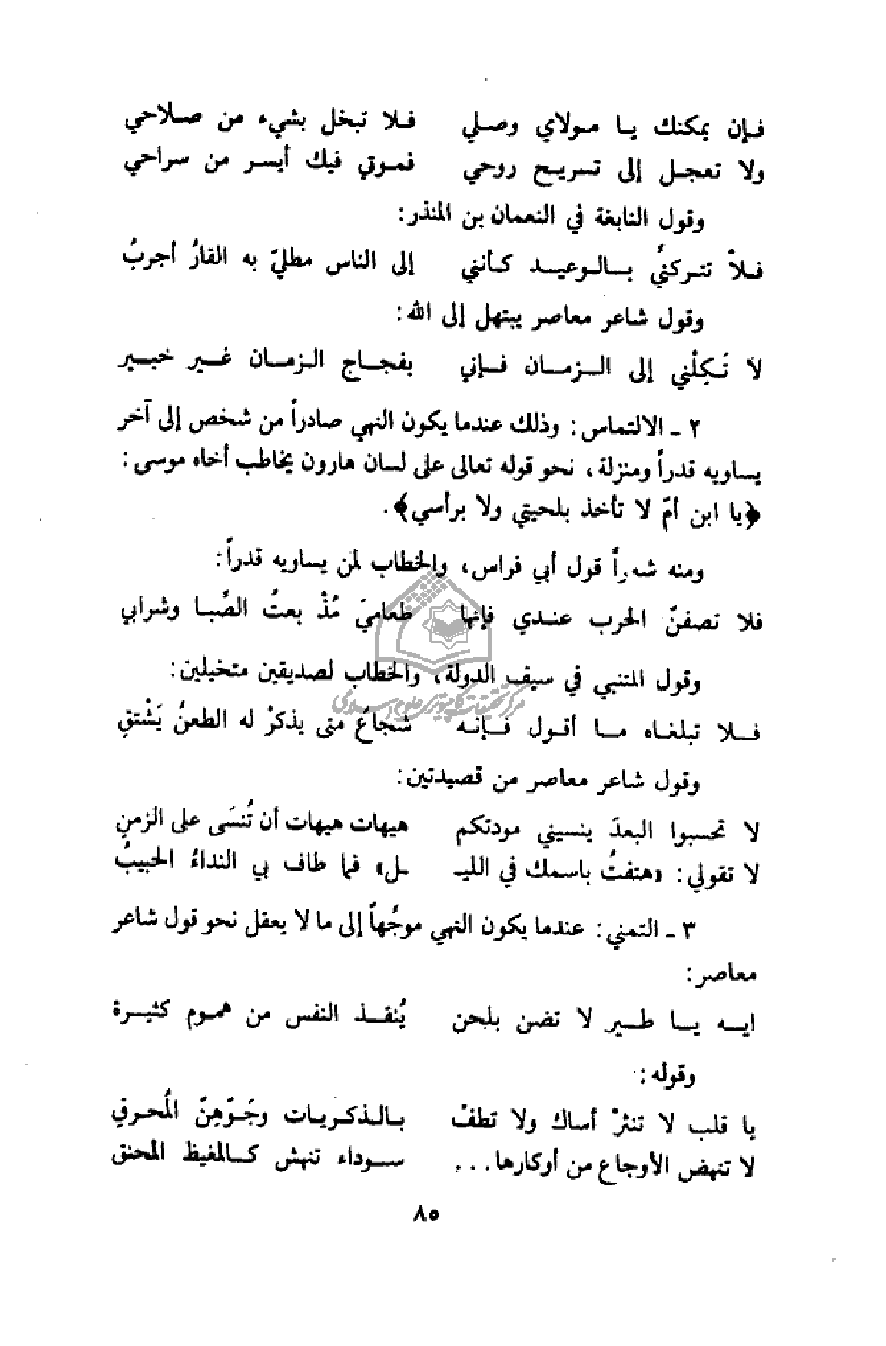 2 - الالتماس: وذلك عند ما يكون النهي صادرا من شخص إلى آخر يساويه قدرا ومنزلة، نحو قوله تعالى على لسان هارون يخاطب أخاه موسى: