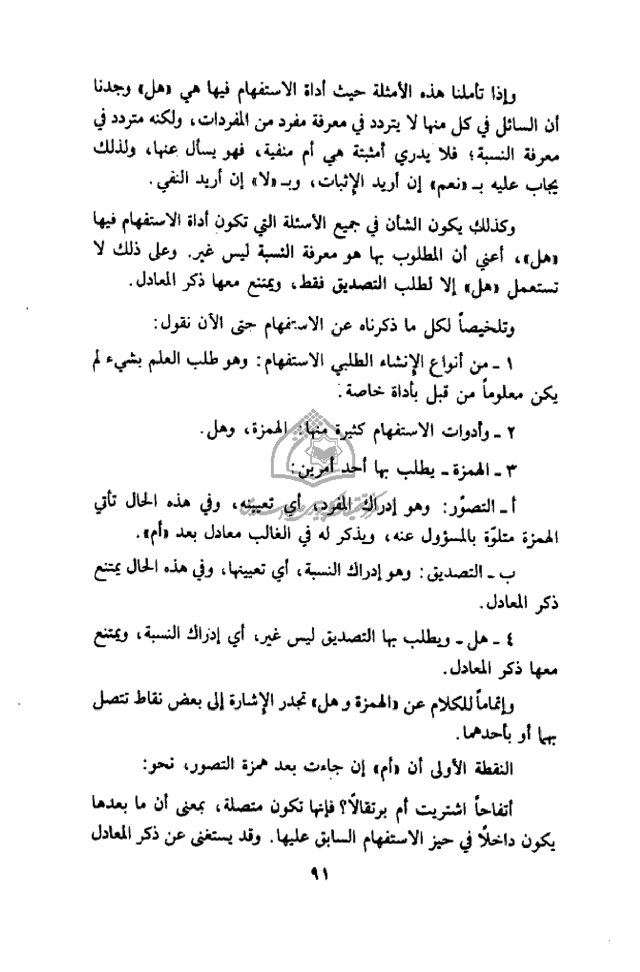 4 - هل- ويطلب بها التصديق ليس غير، أي إدراك النسبة، ويمتنع معها ذكر المعادل.