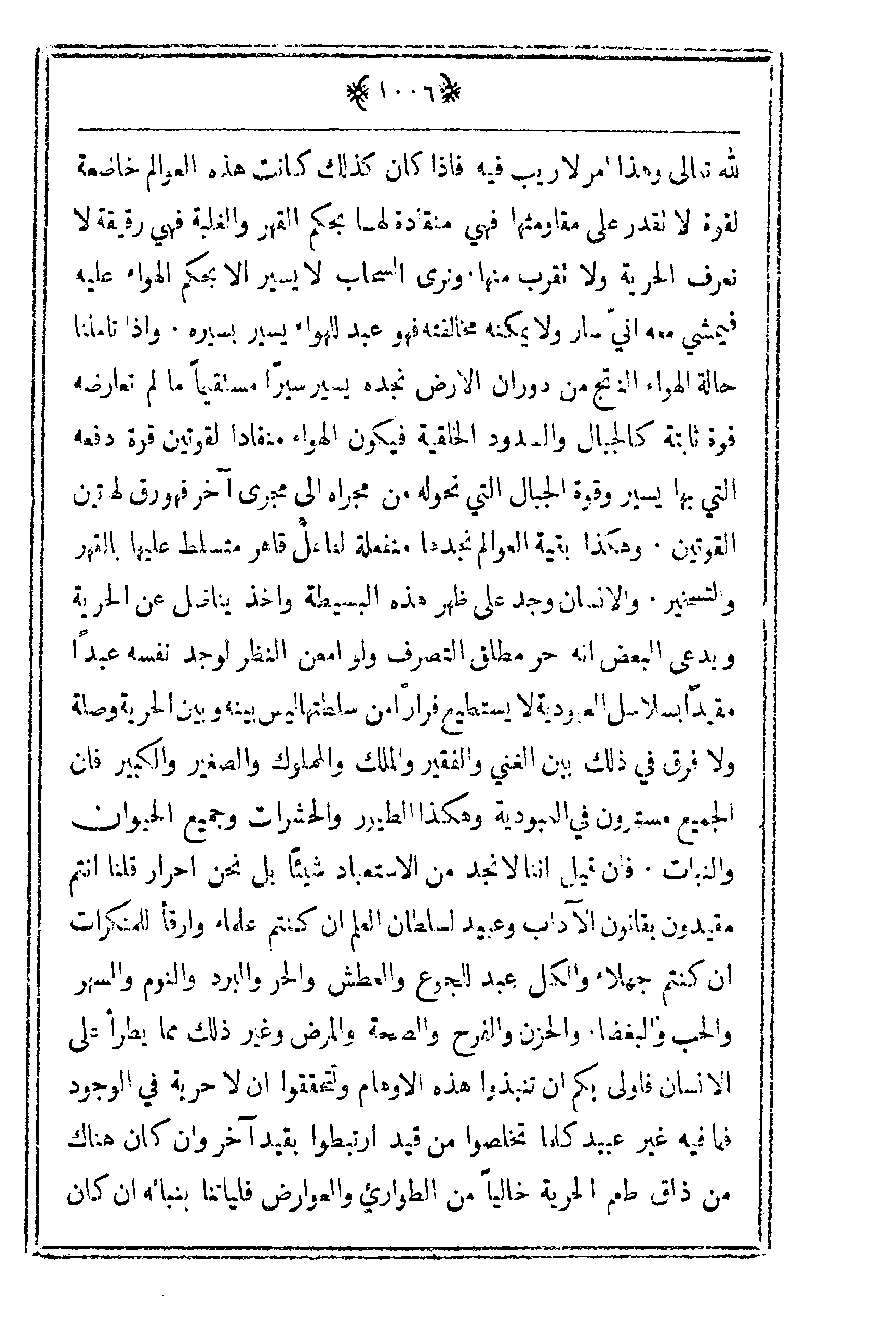 لله تعالى وهذا أمر لا ريب فيه فإذا كان كذلك كانت هذه العوالم خاضعة لقوة لا تقدر على مقاومتها فهي منقادة لها بحكم القهر والغلبة فهي رقيقة لا تعرف الحرية ولا تقرب منها. ونرى السحاب لا يسير إلا بحكم الهواء عليه فيمشي معه إنيّ سار ولا يمكنه مخالفته فهو عبد للهواء يسير بسيره. وإذا تأملنا حالة الهواء الناتج من دوران الأرض نجده يسير سيراً مستقيماً ما لم تعارضه قوة ثابتة كالجبال والسدود الخلقية فيكون الهواء منقاداً لقوتين قوة دفعه التي بها يسير وقوة الجبال التي تحوله من مجراه إلى مجرى آخر فهو رق لهاتين القوتين. وهكذا بقية العوالم نجدها منفعلة لفاعل قاهر متسلط عليها بالقهر والتسخير. والإنسان وجد على ظهر هذه البسيطة وأخذ يناضل عن الحرية ويدعى البعض أنه حر مطلق التصرف ولو أمعن النظر لوجد نفسه عبداً مقيداً بسلاسل العبودية لا يستطيع فراراً من سلطاتها ليس بينه وبين الحرية وصلة ولا فرق في ذلك بين الغني والفقير والملك والمملوك والصغير والكبير فإن الجميع مستورون في العبودية وهكذا الطيور والحشرات وجميع الحيوان والنبات. فإن قيل إننا لا نجد من الاستعباد شيئاً بل نحن أحرار قلنا أنتم مقيدون بقانون الآداب وعبيد لسلطان العلم أن كنتم علماء وأرقأ للمنكران أن كنتم جهلاء والكل عبد للجوع والعطش والحر والبرد والنوم والسهر والحب والبغضا والحزن والفرح والصحة والمرض وغير ذلك مما يطرأ على الإنسان فأولى بكم أن تنبذوا هذه الأوهام وتتحققوا أن لا حرية في الوجود فما فيه غير عبيد كلما تخلصوا من قيد ارتبطوا بقيد آخر وأن كان هناك من ذاق طعم الحرية خالياً من الطوارئ والعوارض فليأتنا بإنبائه إن كان