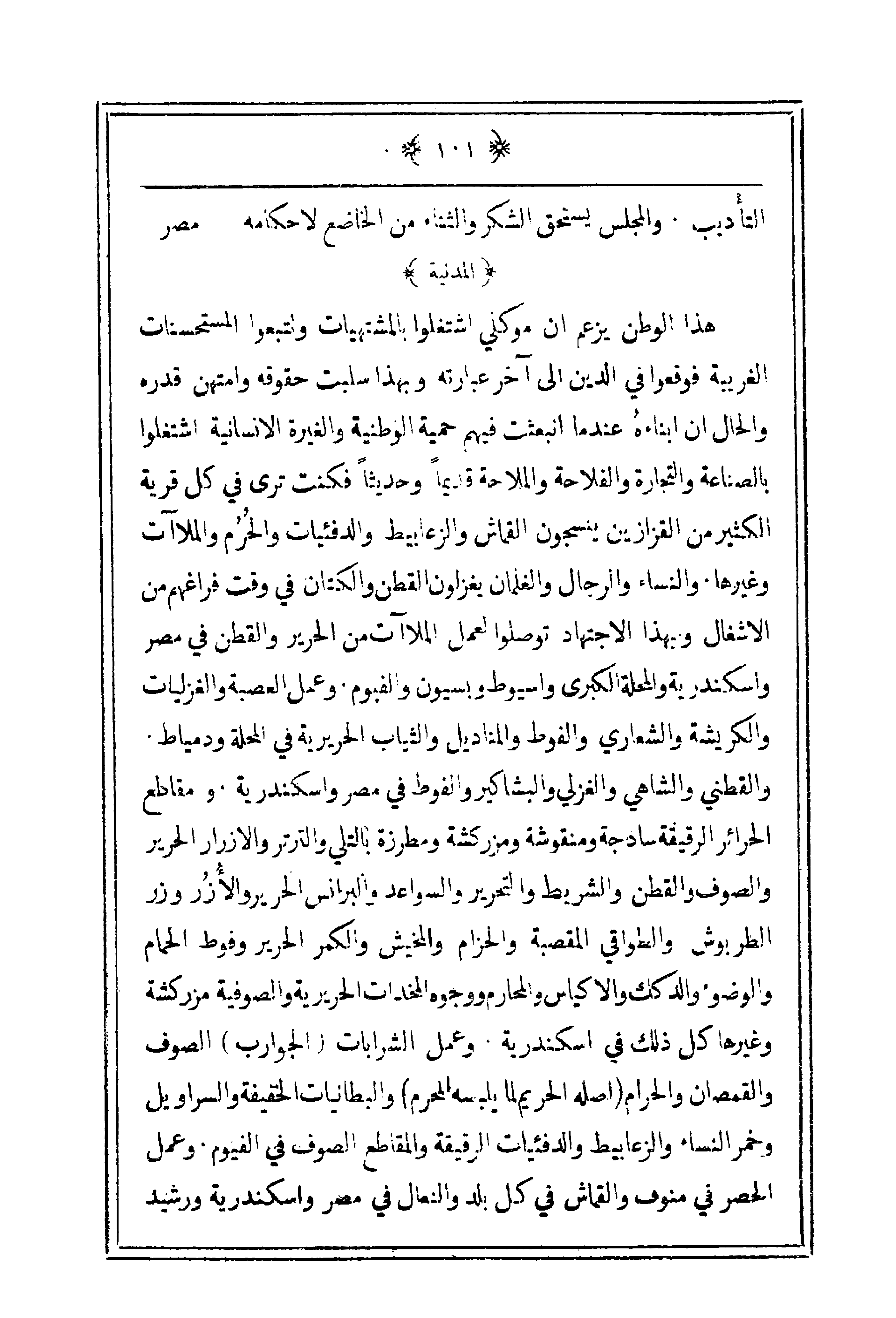 هذا الوطن يزعم أن موكلي اشتغلوا بالمشتهيات وتتبعوا المستحسنات الغريبة فوقعوا في الدين إلى آخر عبارته وبهذا سلبت حقوقه وامتهن قدره والحال أن أبناءه عندما انبعثت فيهم حمية الوطنية والغيرة الإنسانية اشتغلوا بالصناعة والتجارة والفلاحة والملاحة قديماً وحديثاً فكنت ترى في كل قرية الكثير من القزازين ينسجون القماش والزعابيط والدفئيات والحُرُم والملاءات وغيرها. والنساء والرجال والغلمان يغزلون القطن والكتان في وقت فراغهم من الأشغال وبهذا الاجتهاد توصلوا لعمل الملاءات من الحرير والقطن في مصر وإسكندرية والمحلة الكبرى وأسيوط وبسيون والفيوم. وعمل العصبة والغزليات والكريشة والشعاري والفوط والمناديل والثياب الحريرية في المحلة ودمياط. والقطني والشاهي والغزلي والبشاكير والفوط في مصر وإسكندرية. ومقاطع الحرائر الرقيقة سادجة ومنقوشة ومزركشة ومطرزة بالتلي والترتر والأزرار الحرير والصوف والقطن والشريط والتحرير والسواعد والبرانس الحرير والأُزُر وزر الطربوش والطواقي المقصبة والحزام والمخيش والكمر الحرير وفوط الحمام والوضوء والدكك والأكياس والمحارم ووجوه المخدات
