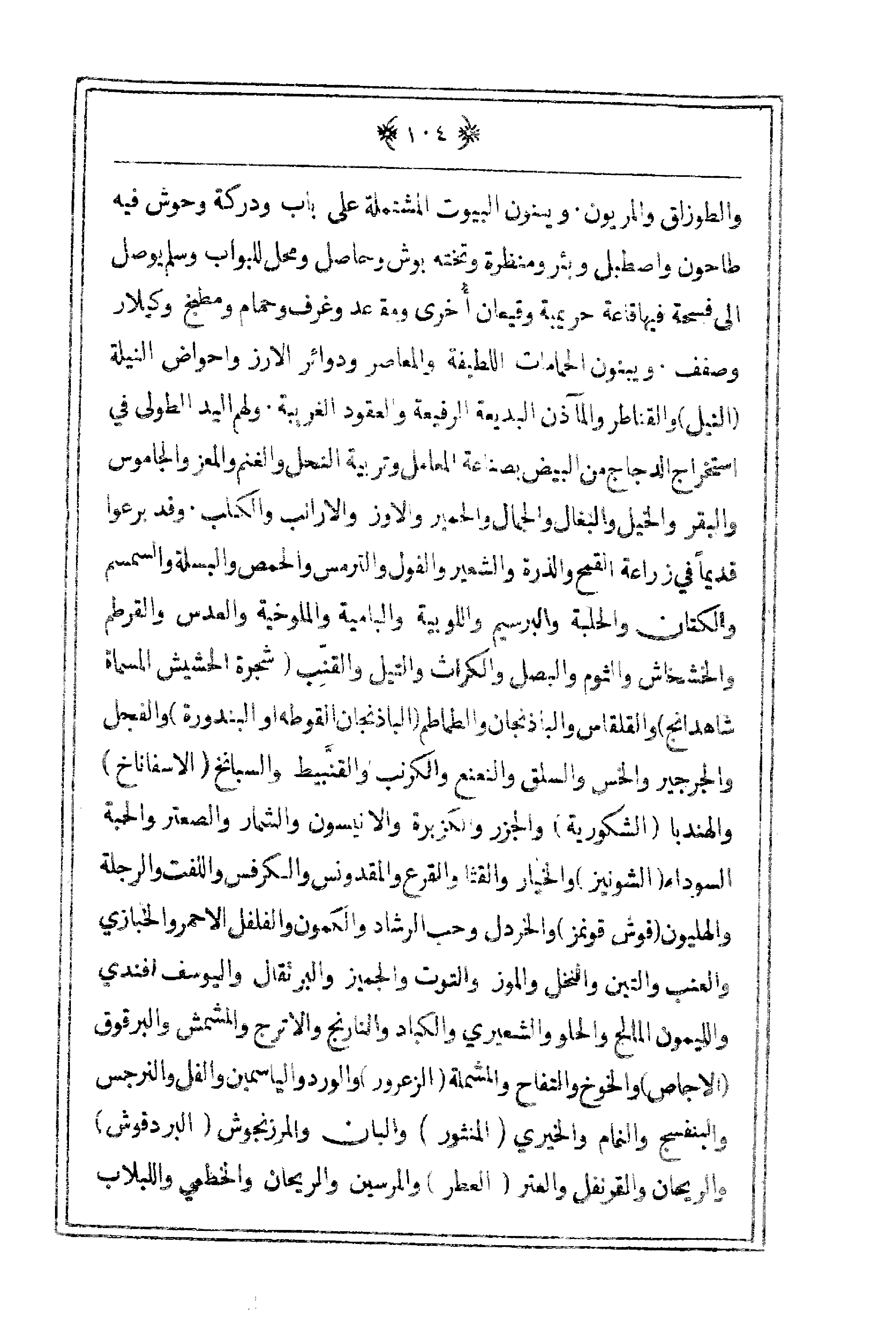 والكمون والفلفل الأحمر والخبازى والعنب والتين والنخل والموز والتوت والجميز والبرتقال واليوسف أفندي والليمون المالح والحلو والشعيري والكبد والنارنج والأترج والمشمش والبرقوق (الإجاص) والخوخ والتفاح والمشملة (الزعرور) والورد والياسمين والفل والنرجس والبنفسج والنمام والخيري (المنثور) والبان والمرزنجوش (البردقوش) والريحان والقرنفل والعتر (العطر) والمرسين والريحان الخطمي واللبلاب