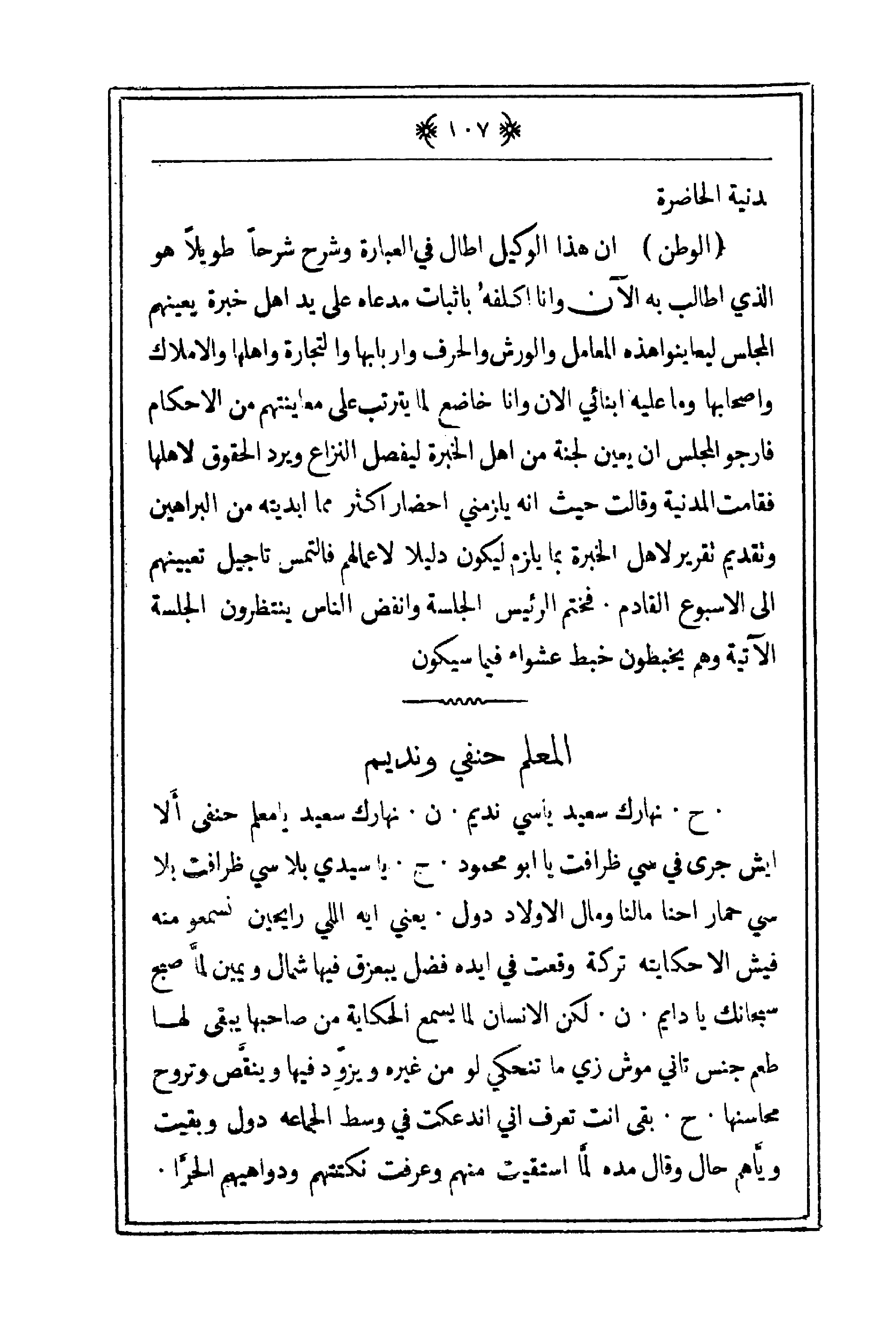 ح. نهار سعيد يا سي نديم. ن. نهارك سعيد يا معلم حنفي ألا ايش جرى في سي ظرافت يا أبو محمود. ح. يا سيدي بلا سي ظرافت بلا سي حمار احنا مالنا ومال الأولاد دول. يعني ايه اللي رايحين نسمعو منه فيش إلا حكايته تركة وقعت في ايده فضل يبعزق فيها شمال ويمين لما صبح سبحانك يا دايم. ن. لكن الإنسان لما يسمع الحكاية من صاحبها يبقى لها طعم جنس تاني موش زي ما تنحكى لو من غيره ويزود فيها وينقّص وتروح محاسنها. ح. بقى انت تعرف إني اندعكت في وسط الجماعه دول وبقيت ويّاهم حال وقال مده لما استقيت منهم وعرفت نكتتهم ودواهيهم الحرّا.