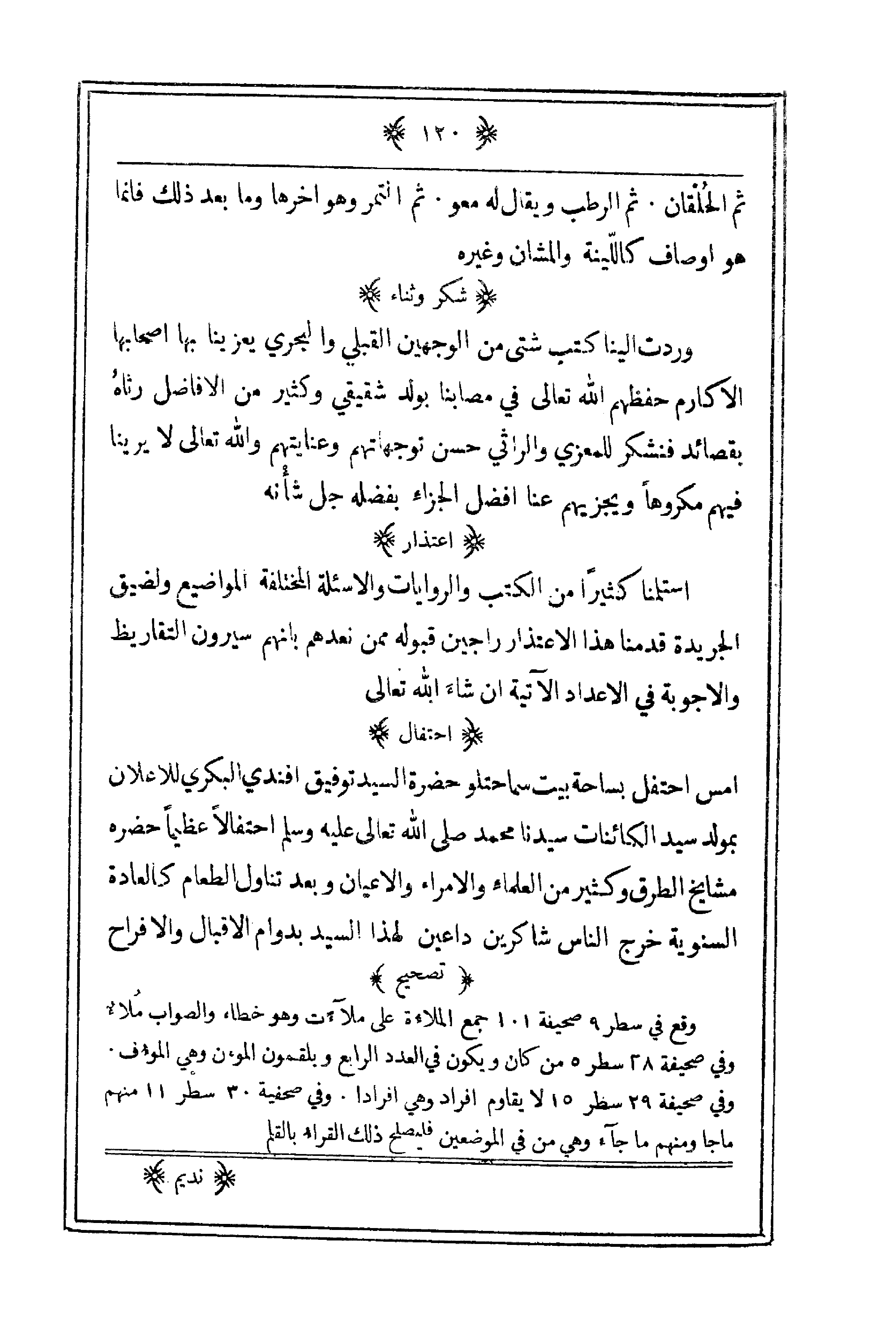 وقع في سطر 9 صحيفة 101 جمع الملاءة على ملآءت وهو خطاء والصواب ملاءٌ وفي صحيفة 35 سطر 5 من كان ويكون في العدد الرابع ويلقمون المؤن وهي المؤف. وفي صحيفة 29 سطر 15 لا يقاوم أفراد وهي أفراداً. وفي صحيفة 30 سطر 11 منهم ما جا ومنهم ما جآء وهي من في الموضعين فليصلح ذلك القراء بالقلم.