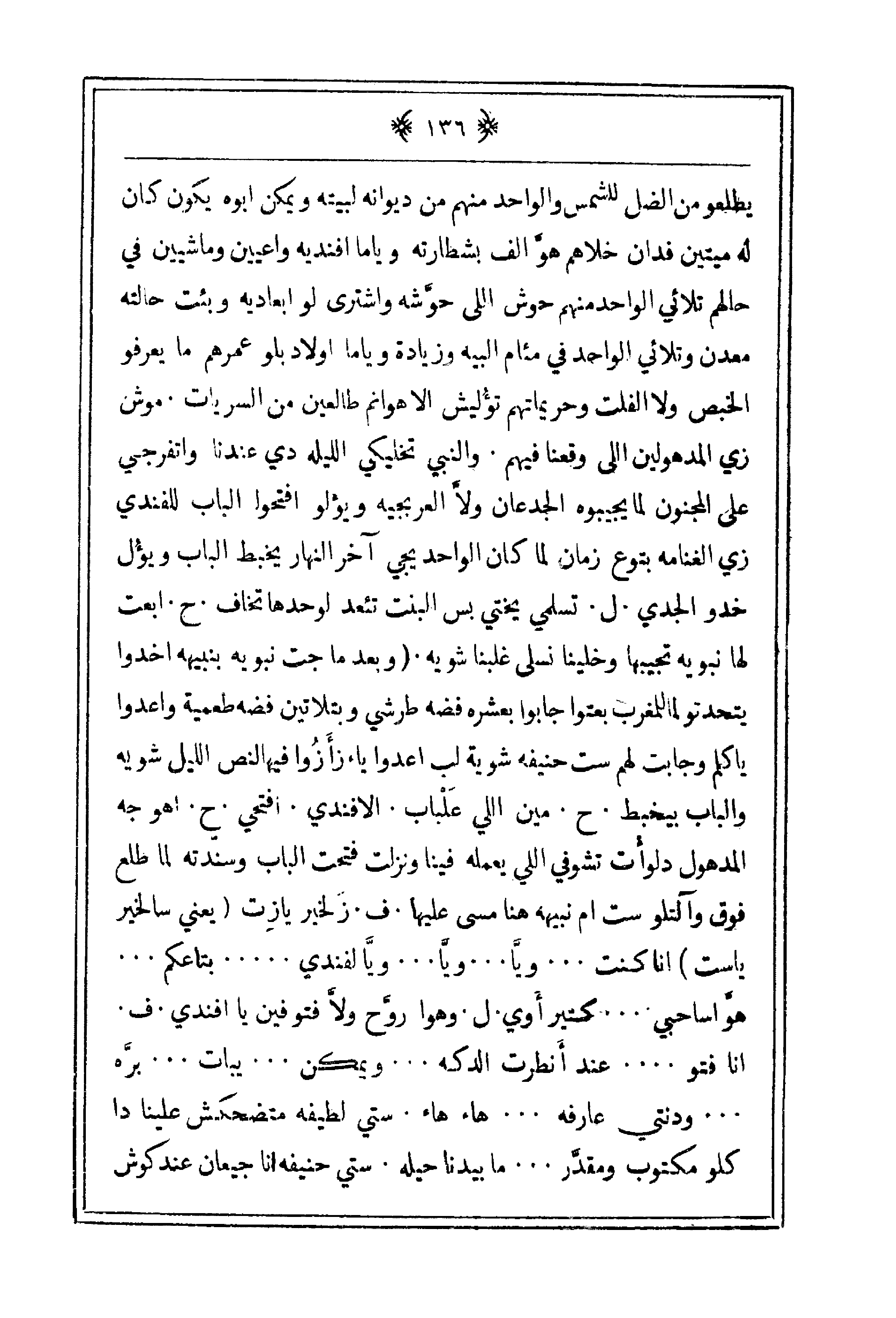 يطلعو نم الظل للشمس والواحد منهم من ديوانه لبيته ويمكن أبوه يكون كان له متين فدان خلاهم هوّ ألف بشطارته وياما افنديه واعيين وماشيين في حالهم تلائي الواحد منهم حوش اللي حوّشه واشترى لو ابعاديه وبئت حالته معدن وتلائي الواحد في مئام البيه وزيارة وياما اولاد بلو عمرهم ما يعرفة الخبص ولا الفلت وحريماتهم تؤلسيش إلا هوانم طالعين من السريات. موش زي المدهولين اللي وقعنا فيهم. والنبي تخليكي الليله دي عندنا واتفرجي على المجنون لما يجيبونه الجدعان ولاّ العربجيه ويؤلو افتحوا الباب للفندي زي الغنامه بتوع زمان لما كان الواحد يجي ىخر النهار يخبط الباب ويؤل خدو الجدي. ل. تسلمي يختي بس البنت تئعد لوحدها تخاف. ح. ابعت لها نبويه تجيبها وخلينا نسلى غلبنا شويه. (وبعد ما جت نبويه بنبيه اخذوا يتحدتو لما للمغرب يعتوا جابوا بعشره فضه طرشي وبتلاتين فضه طعمية واعدوا ياكلهم وجابت لهم ست حنيفه شويه لب اعدوا يءزأزوا فيها لنص الليل شويه والباب يخبط. ح. مين اللي علباب. الأفندي. افتجحي. ح. اهو جه المدهول دلوأت تشوفي اللي يعمله فينا ونزلت فتحا الباب وسندّته لما طلع فوق وآلتلو ست أن نبيهه هنا مسى عليها. ف. زلخير يارزت (يعني سالخير ياست) انا كنت. . . وياَّ. . . وياَّ. . الأفندي. . . بتاعكم. . هوَّاساجي. . كثيراأ وي. ل. وهو روّح فتوفين يا افندي. ف. انا فتو. . . عند أنطرت الدكه. . هاء هاء ستي لطبفه متضحكش علينا دا كلو مكتوب ومقدّر. . . ما بيدنا حيله. ستي حنيفه أنا جيعان عند كوش