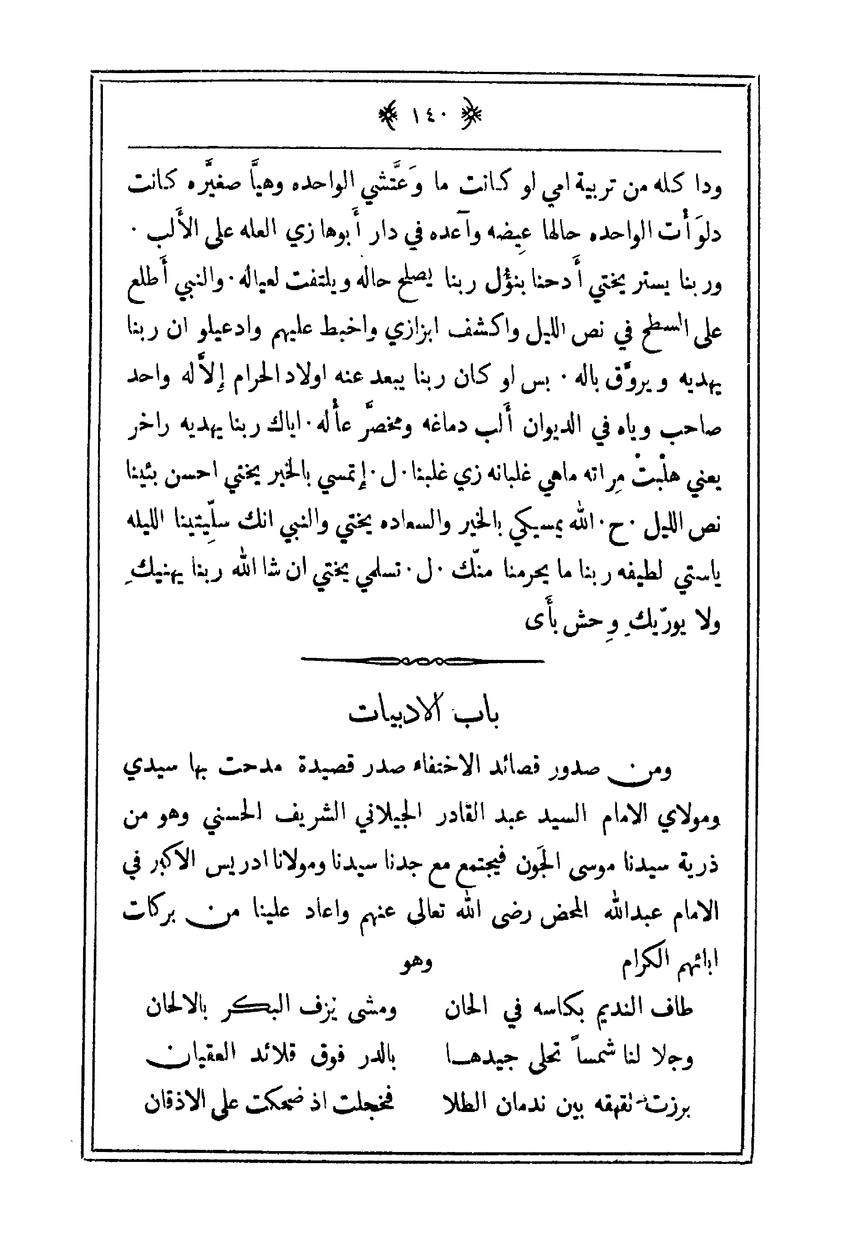 ومن صدور قصائد الاختفاء صدر قصيدة مدحت بها سيدي ومولاي الإمام السيد عبد القادر الجيلاني الشريف الحسيني وهو من ذرية سيدنا موسى الجون فيجتمع مع جدنا سيدنا ومولانا إدريس الأكبر في الإمام عبد الله المحض رضي الله تعالى عنهم وأعاد علينا من بركات آبائهم الكرام وهو: