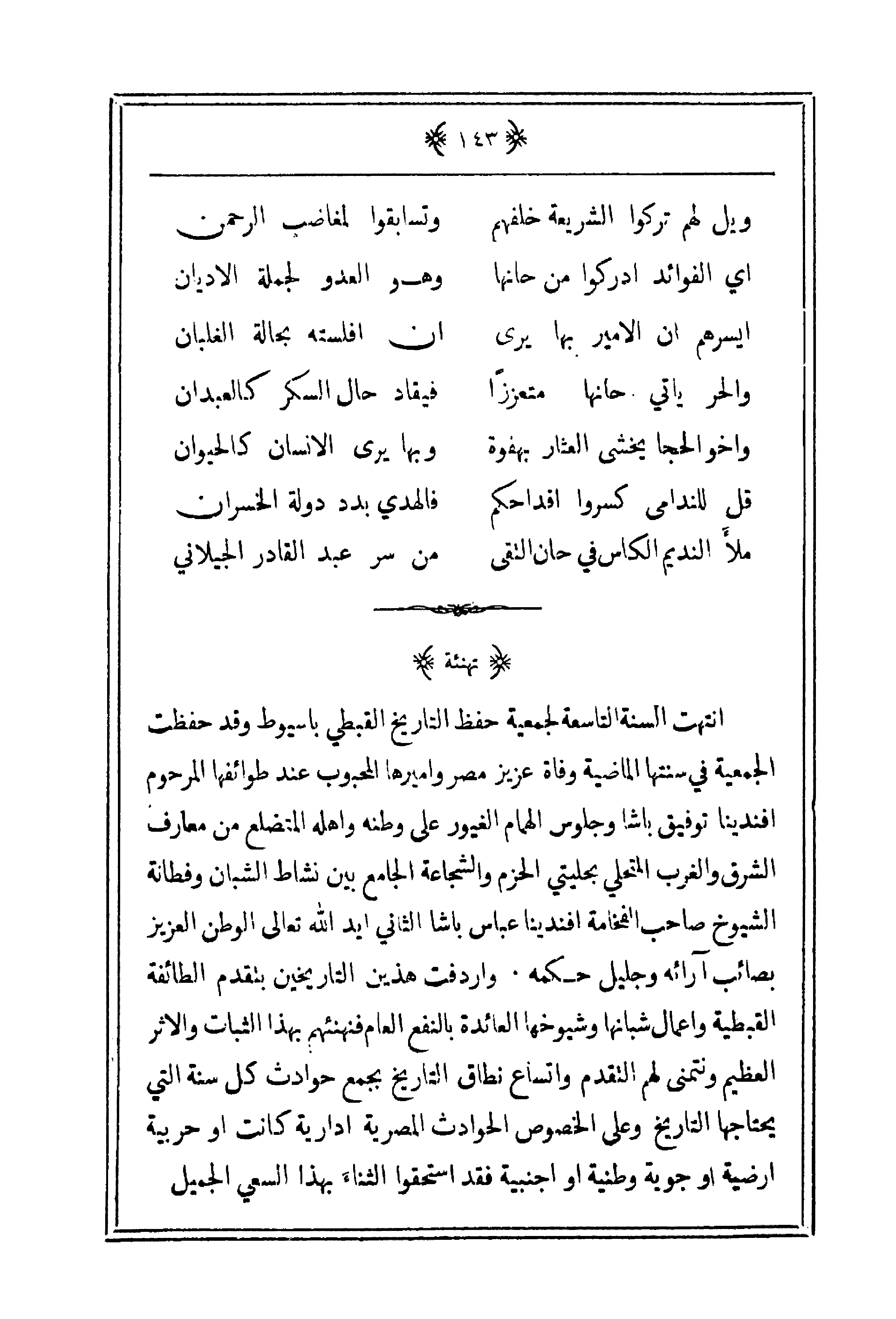 انتهت السنة التاسعة لجمعية حفظ التاريخ القبطي بأسيوط وقد حفظت الجمعية في سنتها الماضية وفاة عزيز مصر وأميرها المحبوب عند طوائفها المرحوم أفندينا توفيق باشا وجلوس إلهام الغيور على وطنه وأهله المتضلع من معارف الشرق والغرب المتحلي بحليتي الحزم والشجاعة الجامع بين نشاط الشبان وفطانة الشيوخ صاحب الفخامة أفندينا عباس باشا الثاني أيد الله تعالى الوطن العزيز بصائب آرائه وجليل حكمه. وأردفت هذين التاريخين بتقديم الطائفة القبطية وأعمال شبانها وشيوخها العائدة بالنفع العام فنهنئهم بهذا الثبات والأثر العظيم ونتمنى لهم التقدم واتساع نطاق التاريخ بجمع حوادث كل سنة التي يحتاجها التاريخ وعلى الخصوص الحوادث المصرية إدارية كانت أو حربية أرضية أو جوية وطنية أو أجنبية فقد استحقوا الثناء بهذا السعي الجميل.