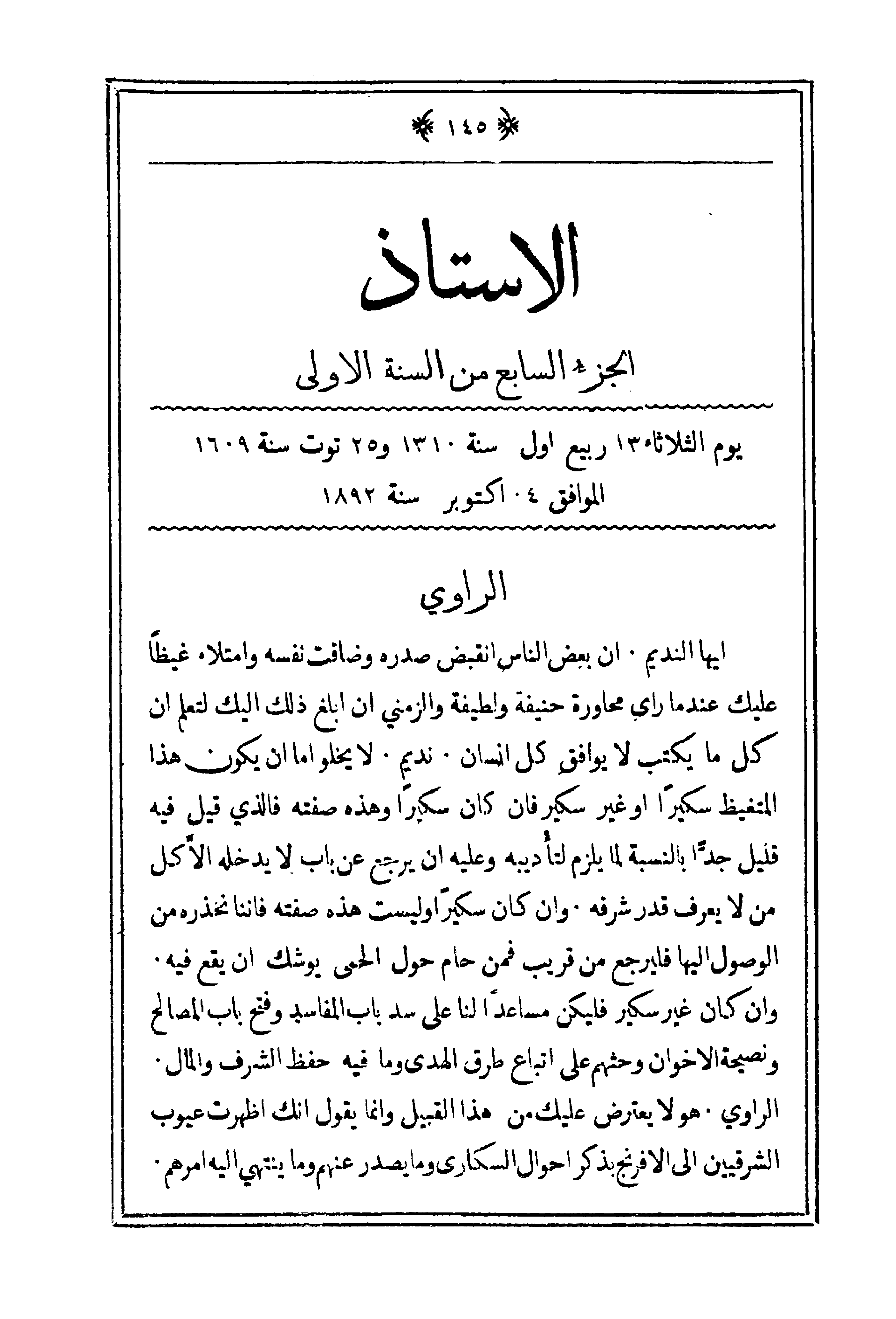أيها النديم. إن بعض الناس انقبض صدره وضاقت نفسه وامتلأ غيظاً عليك عندما رأى محاورة حنيفة ولطيفة وألزمني أن أبلغ ذلك إليك لتعلم أن كل ما يكتب لا يوافق كل إنسان. نديم. لا يخلو إما أن يكون هذا المتغيظ سكيراً أو غير سكير فإن كان سكيراً وهذه صفته فالذي قيل فيه قليل جداً بالنسبة لما يلزم لتأديبه وعليه أن يرجع عن باب لا يدخله إلا كل من لا يعرف قدر شرفه. وإن كان سكيراً وليست هذه صفته فإننا نحذره من الوصول إليها فليرجع من قريب فمن حام حول الحمى يوشك أن يقع فيه. وإن كان غير سكير فليكن مساعداً لنا على سد باب المفاسد وفتح باب المصالح ونصيحة الإخوان وحثهم على اتباع طرق الهدى وما فيه حفظ الشرف والمال. الراوي. هو لا يعترض عليك من هذا القبيل وإنما يقول أنك أظهرت عيوب الشرقيين إلى الإفرنج بذكر أحوال السكارى وما يصدر عنهم وما ينتهي إليه أمرهم.