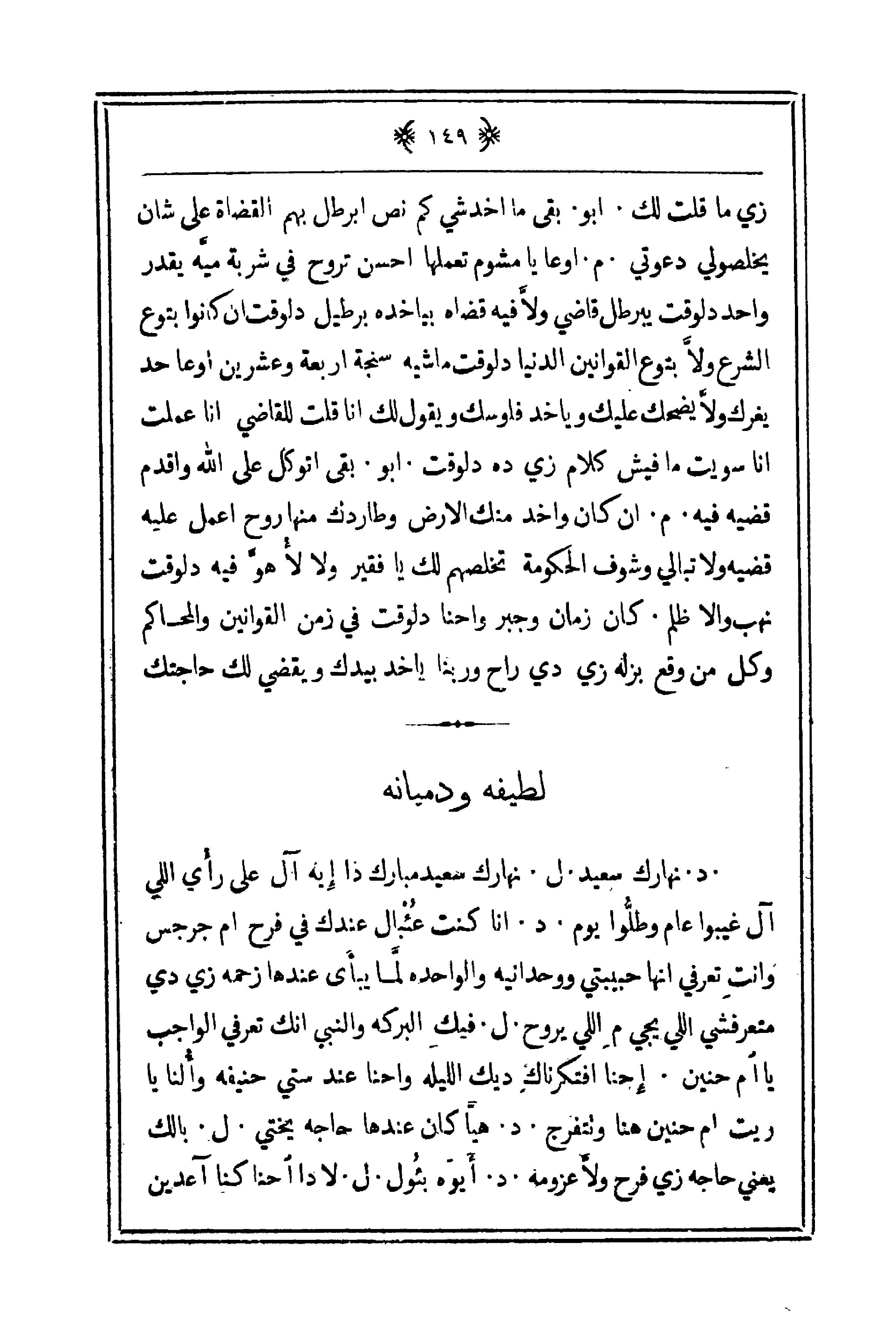 زي ما قلت لك. أبو. بقى ما اخدشي كم نص أبرطل بهم القضاة على شان يخلصولي دعوتي. م. أوا يا مشوم تعملها أحسن تروح في شربة ميّه يقدر واحد دلوقت يبرطل قاضي ولاّ فيه قضاة بياخده برطيل دلوقت إن كانوا بتوع الشرق ولاّ بتوع القوانين الدنيا دلوقت ماشية سنجة أربعة وعشرين أوعا حد يغرك ولا يضحك عليك وياخد فلوسك ويقول لك أنا قلت للقاضي أنا عملت أن سويت ما فيش كلام ز يده دلوقت. أبو. بقى أتوكل على الله وأقدم قضيه فيه. م. إن كان واخد منك الأرض وطاردك منها روح اعمل عليه قضية ولا تبالي وشوف الحكومة تخلصهم لك يا فقير ولا لأ هوَّ فيه دلوقت نهب والا ظلم. كان زمان وجبر واحنا دلوقت في زمن القوانين والمحاكم وكل من وقع بزل هزي دي راح وربنا ياخد بيدك ويقضي لك حاجتك.