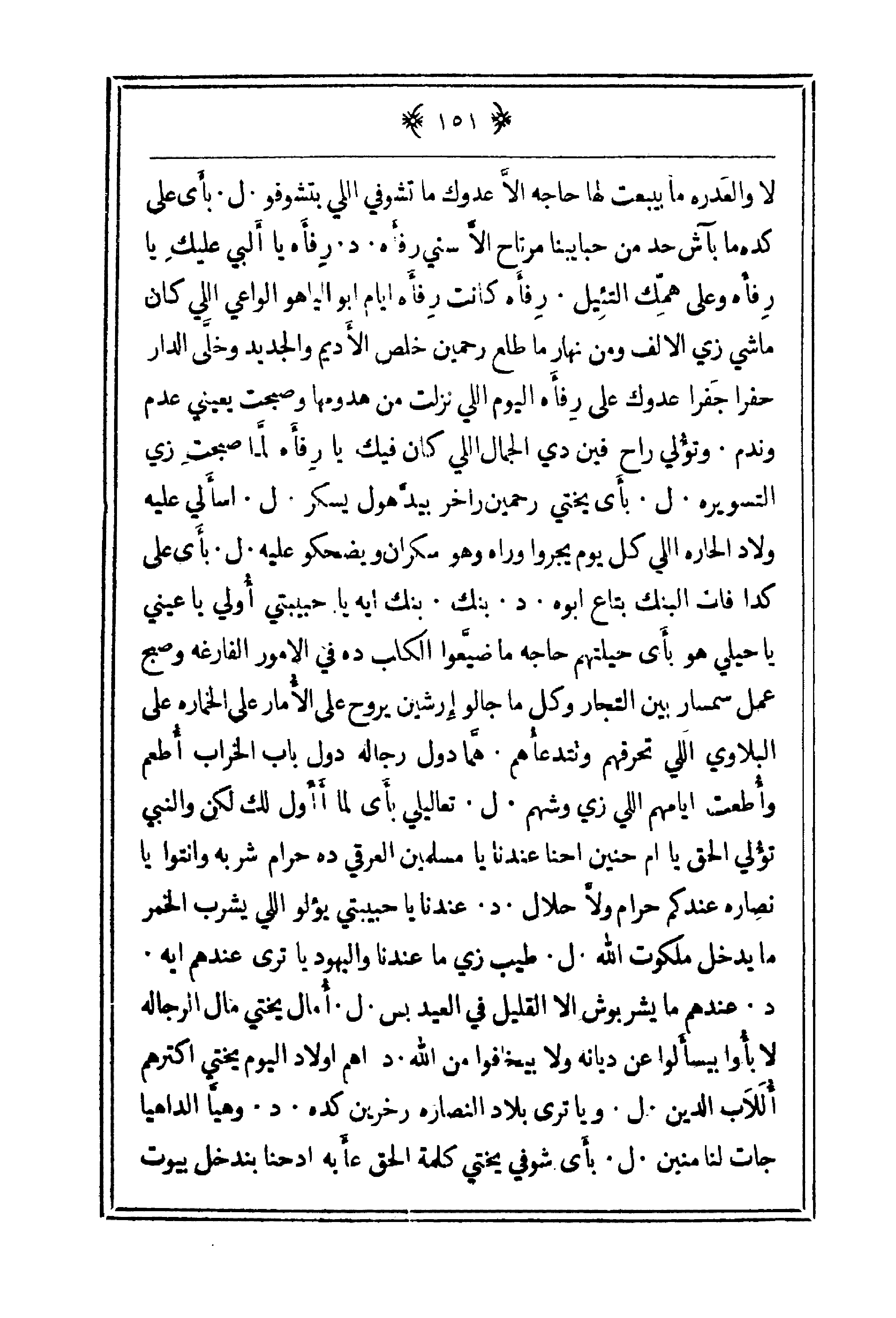 زي الألف ومن نهار ما طلع رحمين خلص الأديم والجديد وخلّى الدار حفرا جَفرا عدوك على رِفأه اليوم اللي نزلت من هدومها وصبحت يعيني عدم وندم. وتؤلي راح فين دي الجمال اللي كان فيك يا رِفأه لما صبحت زي التسويره. ل. بأى يختي رحمين راخر بيدّهول يسكر. ل. اسألي عليه ولاد الحاره اللي كل يوم يجروا وراه وهو سكران ويضحكو عليه. ل. باى على كدا فان البنك بتاع أبوه. د. بنك. بنك ايه يا حبيبتي أولي يا عيني يا حيلي هو باى حيلتهم حاجه ما ضيّعوا الكلب ده في الأمور الفارغة وصبح عمل سمسار بين التجار وكل ما جالو إرشين يروح على الأمار على الخماره على البلاوي اللي تحرقهم وتتدعأهم. همّا دول رجاله دول باب الخراب أطعم وأطعت أيامهم اللي زي وشهم. ل. تعاليلي بأى لما أأول لك لكن والنبي تؤلي الحق يا أم حنين احنا عندنا يا مسلمين العرقي ده حرام شربه وانتوا يا نصاره عندكم حرام ولا حلال. د. عندنا يا حبيبتي يؤولو اللي يشرب الخمر ما يدخل ملكوت الله. ل. طيب زي ما عندنا واليهود يا ترى عندهم ايه. د. عندهم ما يشربوش إلا القليل في العيد بس. ل. أمال يختي مال الرجاله لا بأواب يسألوا عن ديانه ولا بيخافوا من الله. د. أهم أولاد اليوم يختي أكترهم ألَلاب الدين. ل. ويا ترى بلاد النصارة رخرين كده. د. وهيّا الداهيا جات لنا منين. ل. بأى شوفي يختي كلمة الحق عأبه ادحنا بندخل بيوت