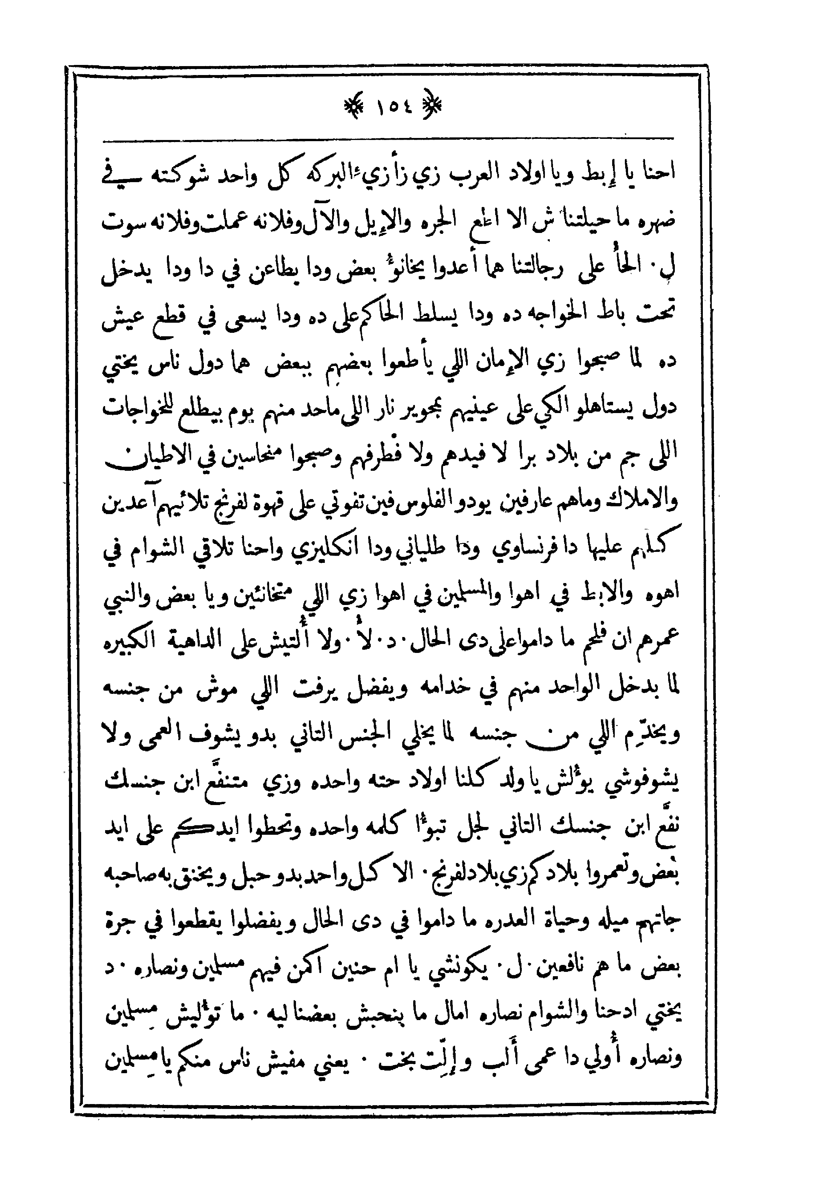 سوت. ل. الحأ على رجالتنا هما اعدوا يخانؤ بعض ودا يطاعن في دا ودا يدخل تحت باط الخواجه ده ودا يسلط الحاكم على ده ودا يسعى في قطع عيش ده لما صبحوا زي الإمان اللي يأطعوا بعضهم ببعض هما دول ناس يختي دول يستاهلو الكي على عينهم بمحوير نار اللي ما حد منهم يوم بيطلع للخواجات اللي جم من بلاد برا لا فيدهم ولا فطرفهم وصبحوا منحاسين في الأطيان والأملاك وما م عارفين يودو الفلوس فين تفوتي على قهوة لفرنج تلائيهم آعدين كلهم عليها دا فرنساوي ودا طلياني ودا إنكليزي واحنا تلاقي الشوام في أهوه والإبط في أهوا والمسلمين في أهوا زي اللي متخانئين ويا بعض والنبي عمرهم انفلحهم ما داموا على دى الحال. د. لأ. ولا ألتيش على الداهية الكبيرة لما بدخل الواد منهم في خدامه ويفضل يرفت اللي موش من جنسه ويخدّم اللي من جنسه لما يخلي الجنس التاني بدو يشوف العمى ولا يشوفوشي يؤلش يا ولد كلنا أولاد حته واحده وزي متنفّع ابن جنسك نفّع ابن جنسك التاني لجل تبؤا كلمه واحده وتحطوا ايدكم على ايد بعض وتعمروا بلادكم زي بلاد لفرنج. الا كل واحد بدو حبل ويخنق به صاحبه جاتهم ميله وحياة العدره ما داموا على دى الحال ويفضلوا يقطعوا في جرة بعض ما هم نافعين. ل. يكونشي يا أم حنين أكمن فيهم مسلمين ونصاره. د. يختي ادحنا والشوام ونصاره امال ما بنحبش بعضنا ليه. ما تؤليش مسلمين ونصاره أولي دا عمى ألب وإلّت بخت. يعني مفيش ناس منكم يا مسلمين