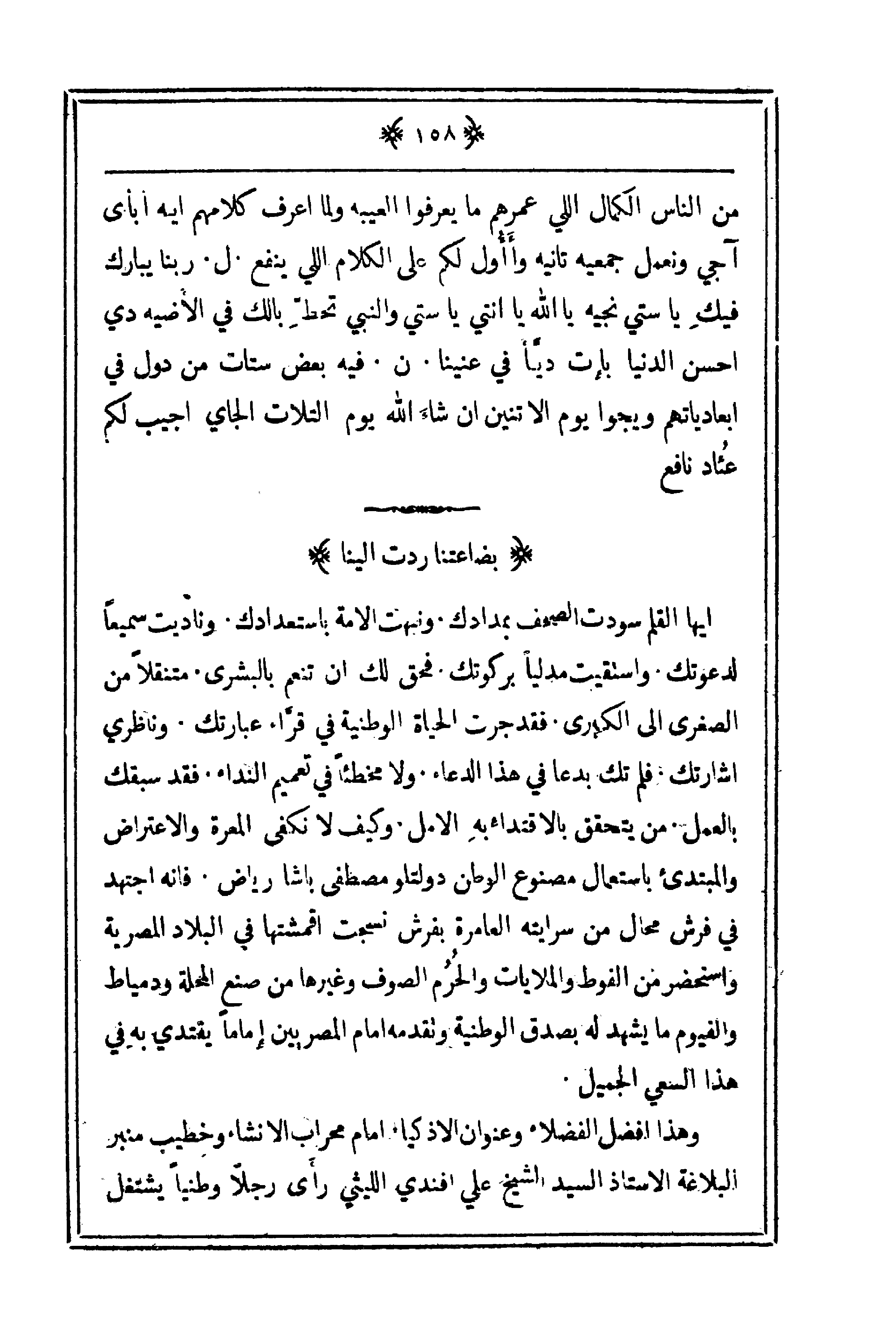أيها القلم سودت الصحف بمدادك. ونبهت الأمة باستعدادك. وناديت سميعاً لدعوتك. واستقيت مدلياً بركوتك. فحق لك أن تنعم بالبشرى. متنقلاً من الصغرى إلى الكبرى. فقد جرت الحياة الوطنية في قراء عبارتك. وناظري إشارتك. فلم تك بدعا في ذا الدعاء. ولا مخطئاً في تعميم النداء. فقد سبقك بالعمل. من يتحقق بالاقتداء به الأمل. وكيف لا نكفي المعرة والاعتراض والمبتدئ باستعمال مصنوع الوطن دولتلو مصطفى باشا رياض. فإنه اجتهد في فرش محال من سرايته العامرة بفرش نسجت أقمشتها في البلاد المصرية واستحضر من الفوط والملايات والحُرُم الصوف وغيرها من صنع المحلة ودمياط والفيوم ما يشهد له بصدق الوطنية وتقدمه أمام المصريين إماماً يقتدي به في هذا السعي الجميل.