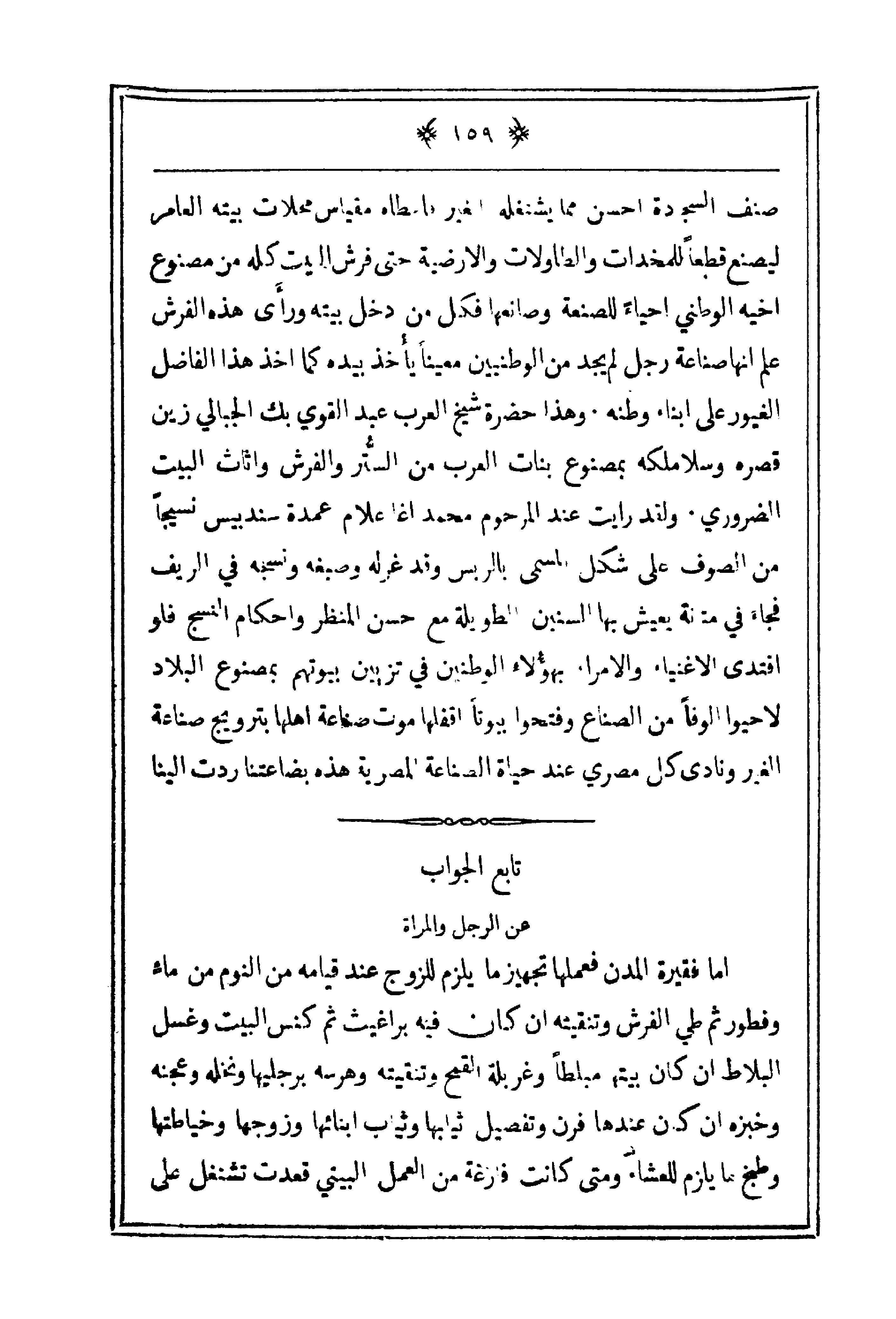 صنف السجادة أحسن مما يشتغله الغير فأعطاه مقياس محلات بيته العامر ليصنع قطعاً للمخدات والطاولات والأرضية حتى فرش البيت كله من مصنوع أخيه الوطني إحياءً للصنعة وصانعها فكل من دخل بيته ورأى هذه الفرش علم أنها صناعة رجل لم يجد من الوطنيين معيناً يأخذ بيده كما أخذ هذا الفاضل الغيور على أبناء وطنه. وهذا حضرة شيخ العرب عبد القوي بك الجبالي زين قصره وسلا ملكه بمصنوع بنات العرب من السُّتر والفرش وأثاث البيت الضروري. ولقد رأيت عند المرحوم محمد آغا علام عمدة سندبيس نسيجاً من الصوف على شكل المسمى بالربس وقد غزله وصبغه ونسجه في الريف فجاء في متانة يعيش بها السنين الطويلة مع حسن المنظر وإحكام النسج فلو اقتدى الأغنياء والأمراء بهؤلاء الوطنيين في تزيين بيوتهم بمصنوع البلاد لأحيوا ألوفاً من الصناع وفتحوا بيوتاً أقفلها موت صناعة أهلها بترويج صناعة الغير ونادى كل مصري عند حياة الصناعة المصرية هذه بضاعتنا ردت إلينا.