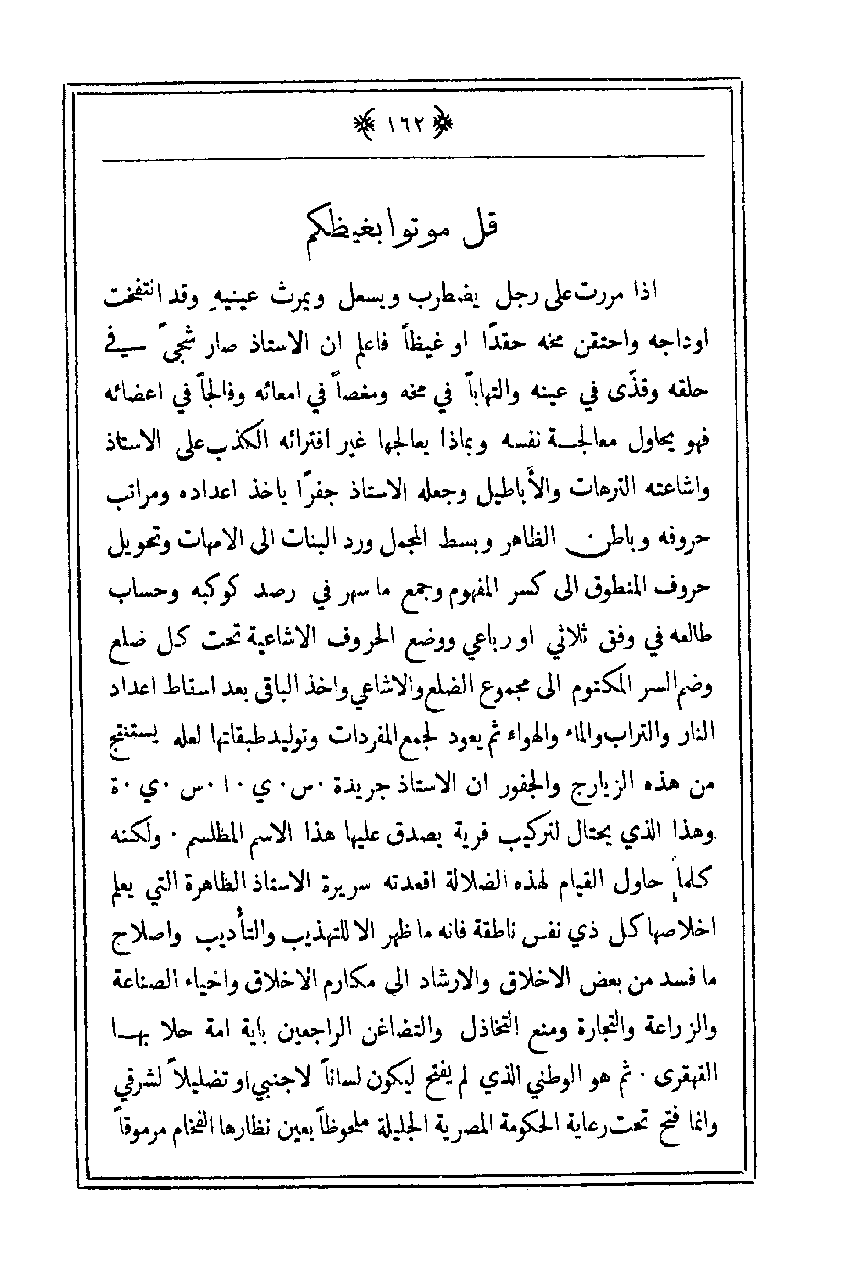 إذا مررت على رجل يضطرب ويسعل ويمرث عينيه وقد انتفخت أوداجه واحتقن مخه حقداً أو غيظاً فاعلم أن الأستاذ صار شجىً في حلقه وقذىً في عينه والتهاباً في مخه ومغصاً في أمعائه وقالجاً في أعضائه فهو يحاول معالجة نفسه وبماذا يعالجها غير افترائه الكذب على الأستاذ وإشاعته الترهات والأباطيل وجعله الأستاذ جفراً يأخذ أعداده ومراتب حروفه وباطن الظاهر وبسط المجمل ورد البنات إلى الأمهات وتحويل حروف المنطوق إلى كسر المفهوم وجمع ما سهر في رصد كوكبه وحساب طالعه في وفق ثلاثي أو رباعي ووضع الحروف الإشاعية تحت كل ضلع وضم السر المكتوم إلى مجموع الضلع والإشاعي وأخذ الباقي بعد إسقاط إعداد النار والتراب والماء والهواء ثم يعود لجمع المفردات وتوليد طبقاتها لعله يستنتج من هذه الزيارج والجفور أن الأستاذ جريدة. س. ي. ا. س. ي. ة. وهذا الذي يحتال لتركيب فرية يصدق عليها هذا الاسم المطلسم. ولكنه كلما حاول القيام لهذه الضلالة أقعدته سريرة الأستاذ الطاهرة التي يعلم إخلاصها كل ذي نفس ناطقة فإنه ما ظهر إلا للتهذيب والتأديب وإصلاح ما فسد من بعض الأخلاق والإرشاد إلى مكارم الأخلاق وإحياء الصناعة والزراعة والتجارة ومنع التخاذل والتضاغن الراجعين بأية أمة حلا بها القهقرى. ثم هو الوطني الذي لم يفتح ليكون لساناً لأجنبي أو تضليلاً لشرقي وإنما فتح تحت رعاية الحكومة المصرية الجليلة ملحوظاً بعين نظارها الفخام مرموقاً