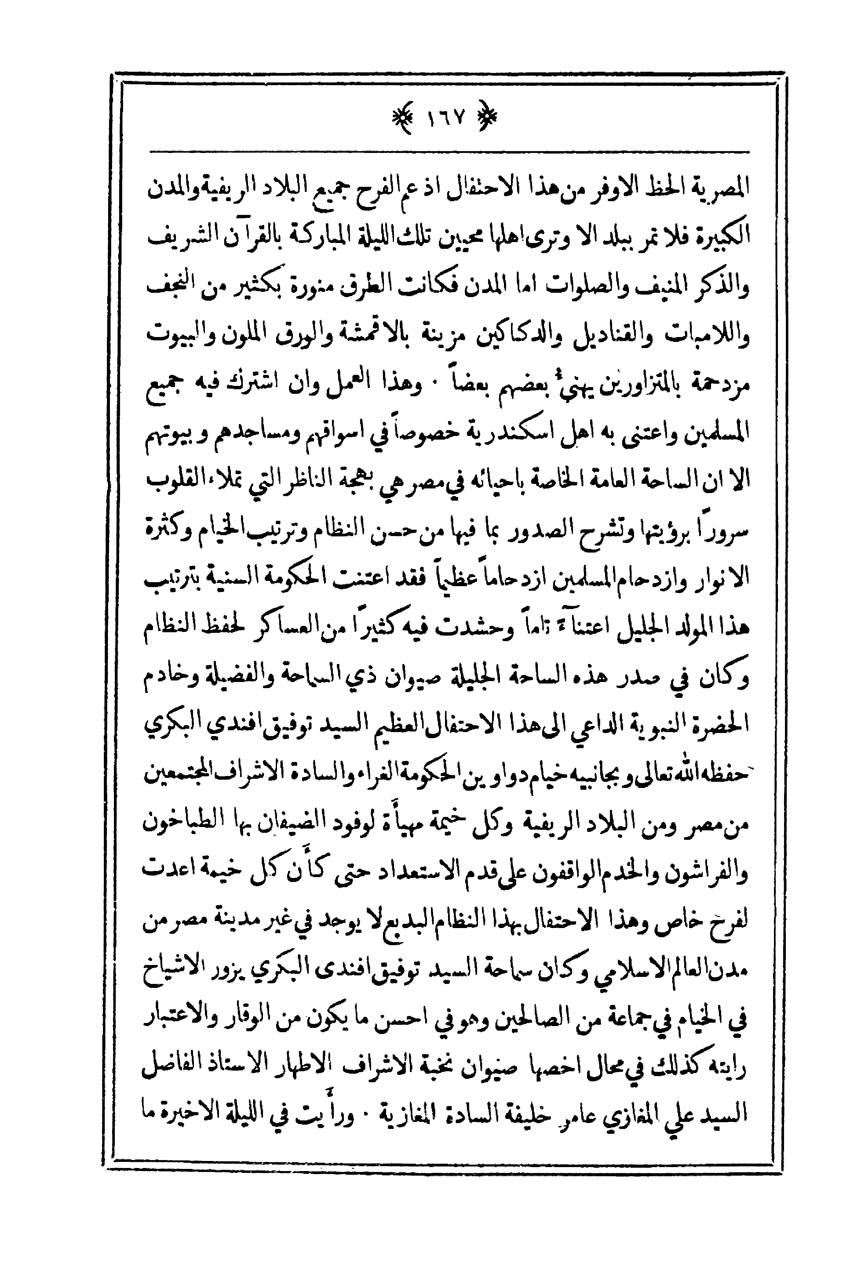 المصرية الحظ الأوفر من هذا الاحتفال إذ عم الفرح جميع البلاد الريفية والمدن الكبيرة فلا تمر ببلد إلا وترى أهلها محيين تلك الليلة المباركة بالقرآن الشريف والذكر المنيف والصلوات أما المدن فكانت الطرق منورة بكثير من النجف واللامبات والقناديل والدكاكين مزينة بالأقمشة والورق الملون والبيوت مزدحمة بالمتزاورين يهنئ بعضهم بعضاً. وهذا العمل وإن اشترك فيه جميع المسلمين واعتنى به أهل إسكندرية خصوصاً في أسواقهم ومساجدهم وبيوتهم إلا أن الساحة العامة الخاصة بإحيائه في مصر هي بهجة الناظر التي تملأ القلوب سروراً برؤيتها وتشرح الصدور بما فيها من حسن النظام وترتيب الخيام وكثرة الأنوار وازدحام المسلمين ازدحاماً عظيماً فقد اعتنت الحكومة السنية بترتيب هذا المولد الجليل اعتناءً تاماً وحشدت فيه كثيراً من العساكر لحفظ النظام وكان في صدر هذه الساحة الجليلة صيوان ذي السماحة والفضيلة وخادم الحضرة النبوية الداعي إلى هذا الاحتفال العظيم السيد توفيق أفندي البكري حفظه الله تعالى وبجانبيه خيام دواوين الحكومة الغراء والسادة الأشراف المجتمعين من مصر ومن البلاد الريفية وكل خيمة مهيأة لوفود الضيفان بها الطباخون والفراشون والخدم الواقفون على قدم الاستعداد حتى كأن كل خيمة أعدت لفرح خاص وهذا الاحتفال بهذا النظام البديع لا يوجد في غير مدينة مصر من مدن العالم الإسلامي وكان سماحة السيد توفيق أفندي البكري يزور الأشياخ في الخيام في جماعة من الصالحين وهو في أحسن ما يكون من الوقار والاعتبار رأيته كذلك فيم حال أخصها صيوان نخبة الأشراف الأطهار الأستاذ الفاضل السيد علي المغازي عامر خليفة السادة المغازية. ورأيت في الليلة الأخيرة ما