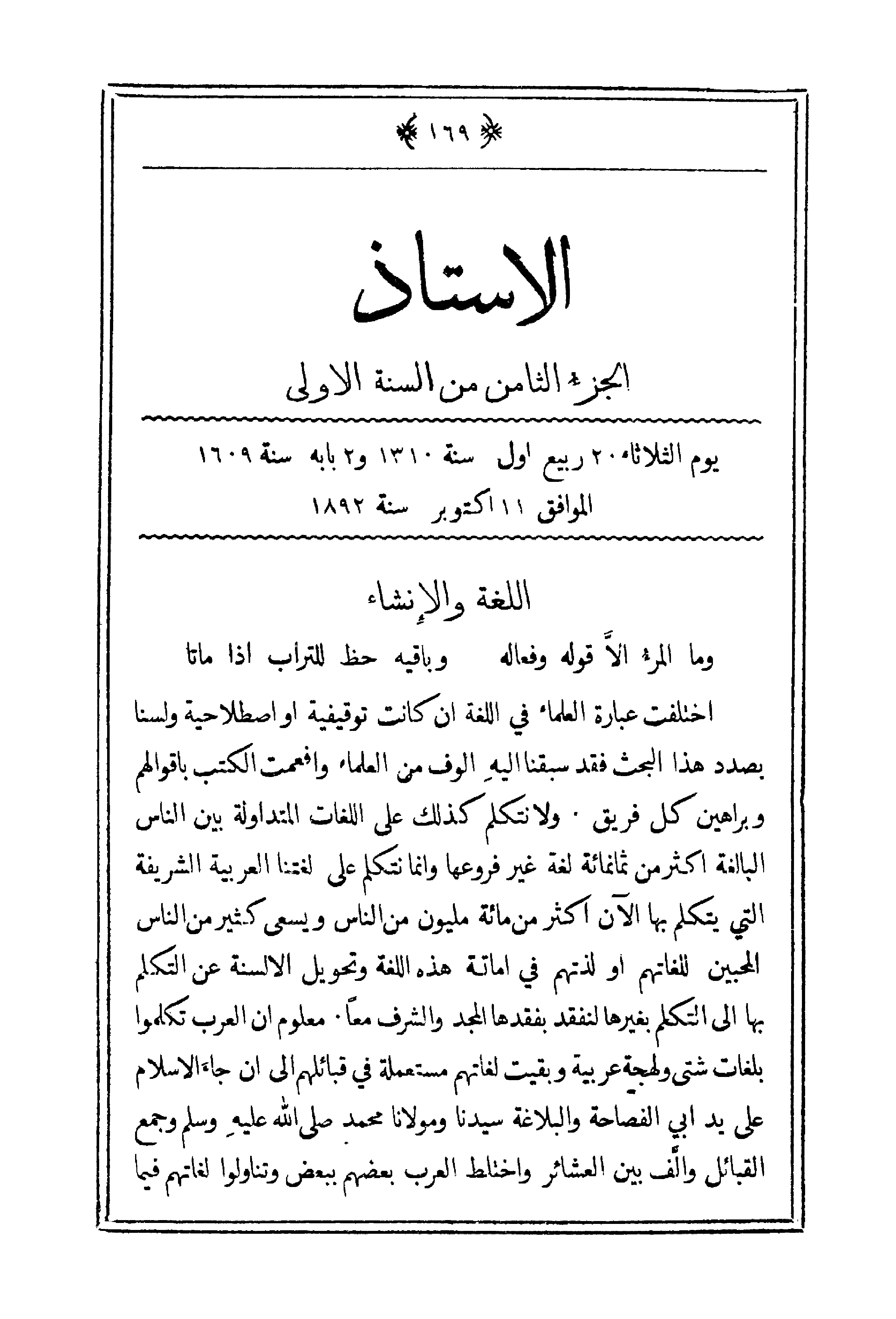 اختلفت عبارة العلماء في اللغة إن كانت توفيقية أو اصطلاحية ولسنا بصدد هذا البحث فقد سبقنا إليه ألوف من العلماء وأفعمت الكتب بأقوالهم وبراهين كل فريق. ولا نتكلم كذلك على اللغات المتداولة بين الناس البالغة أكثر من ثمانمائة لغة غير فروعها وإنما نتكلم على لغتنا العربية الشريفة التي يتكلم بها الآن أكثر من مائة مليون من الناس ويسعة كثير من الناس المحبين للغاتهم أو لذتهم في إناتة هذه اللغة وتحويل الألسنة عن التكلم بها إلى التكلم بغيرها لنفقد بفقدها المجد والشرف معاً. معلوم أن العرب تكلموا بلغات شتى ولهجة عربية وبقيت لغاتهم مستعملة في قبائلهم إلى أن جاء الإسلام على يد أبي الفصاحة والبلاغة سيدنا ومولانا محمد صلى الله عليه وسلم وجمع القبائل وألّف بين العشائر واختلط العرب بعضهم ببعض وتناولوا لغاتهم فيما