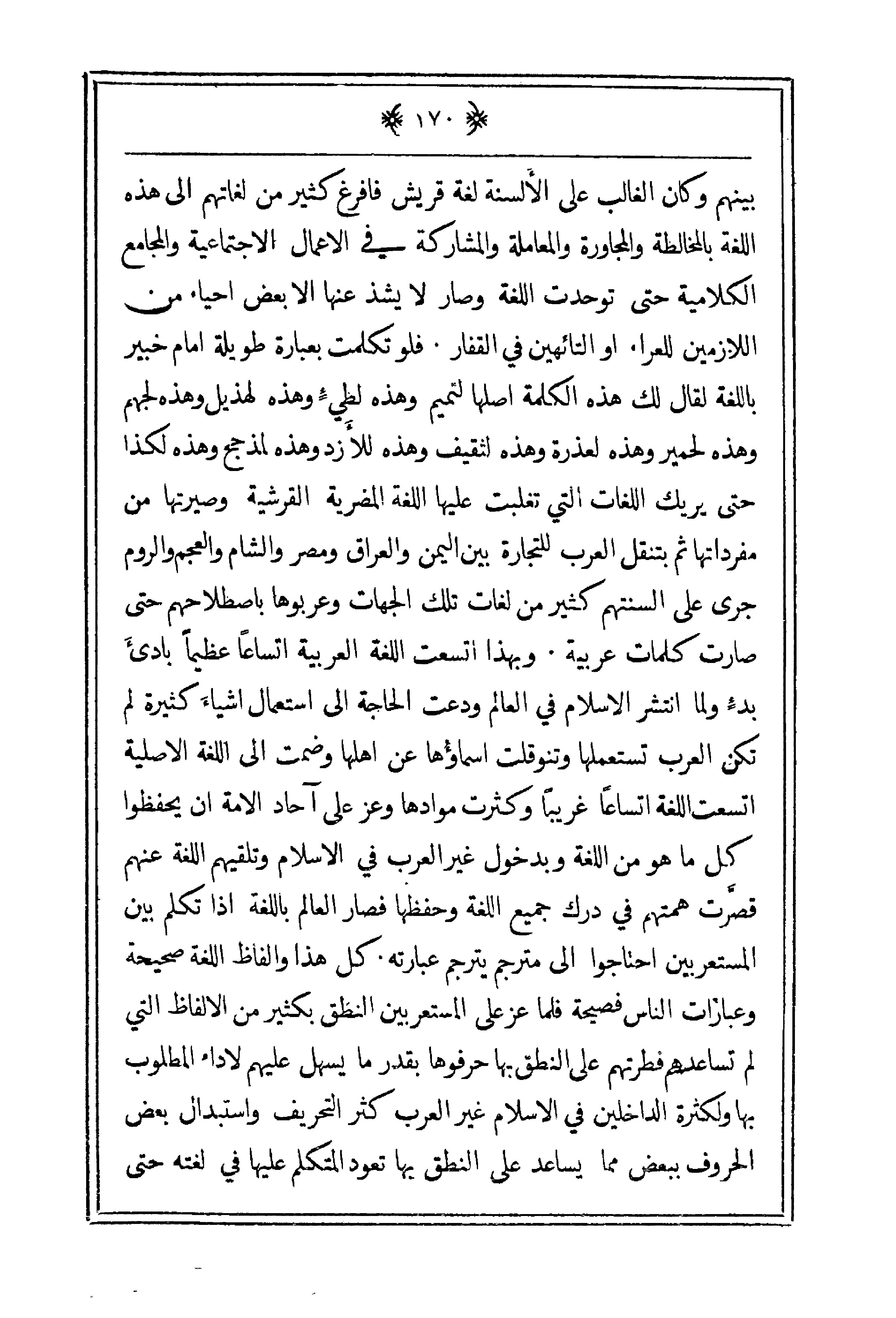 بينهم وكان الغالب على الألسنة لغة قريش فأفرغ كثري من لغاتهم إلى هذه اللغة بالمخالطة والمجاورة والمعاملة والمشاركة في الأعمال الاجتماعية والمجامع الكلامية حتى توحدت اللغة وصار لا يشذ عنها إلا بعض أحياء من اللازمين للعراء أو التائهين في القفاز. فلو تكلمت بعبارة طويلة أمام خبير باللغة لقال لك هذه الكلمة أصلها لتميم وهذه لطي وهذه لهذيل وهذه لجدهم وهذه لحمير وهذه لعذرة وهذه لثقيف وهذه للأزد وهذه لمذحج وهذه لكذا حتى يريك اللغات التي تغلبت عليها اللغة المصرية القرشية وصيرتها من مفرداتها ثم بنتقل العرب للتجارة بين اليمن والعراق ومصر والشام والعجم والروم جرى على ألسنتهم كثير من لغات تلك الجهات وعربوها باصطلاحهم حتى صارت كلمات عربية. وبهذا اتسعت اللغة العربية اتساعاً عظيماً بادئ بدء ولما انتشر الإسلام في العالم ودعت الحاجة إلى استعمال أشياء كثيرة لم تكن العرب تستعملها وتنوقلت أسماؤها عن أهلها وضمت إلى اللغة الأصلية اتسعت اللغة اتساعاً غريباً وكثرت موادها وعز على آحاد الأمة أن يحفظوا كل ما هو من اللغة وبدخول غير العرب في الإسلام وتلقيهم اللغة عنهم قصرت همتهم في درك جميع اللغة وحفظها فصار العالم باللغة إذا تكلم بين المستعربين احتاجوا إلى مترجم يترجم عبارته. كل هذا وألفاظ اللغة صحيحة وعبارات الناس فصيحة فلما عز على المستعربين النطق بكثير من الألفاظ التي لم تساعدهم فطرتهم على النطق بها حرفوها بقدر ما يسهل عليهم لأداء المطلوب بها ولكثرة الداخلين في