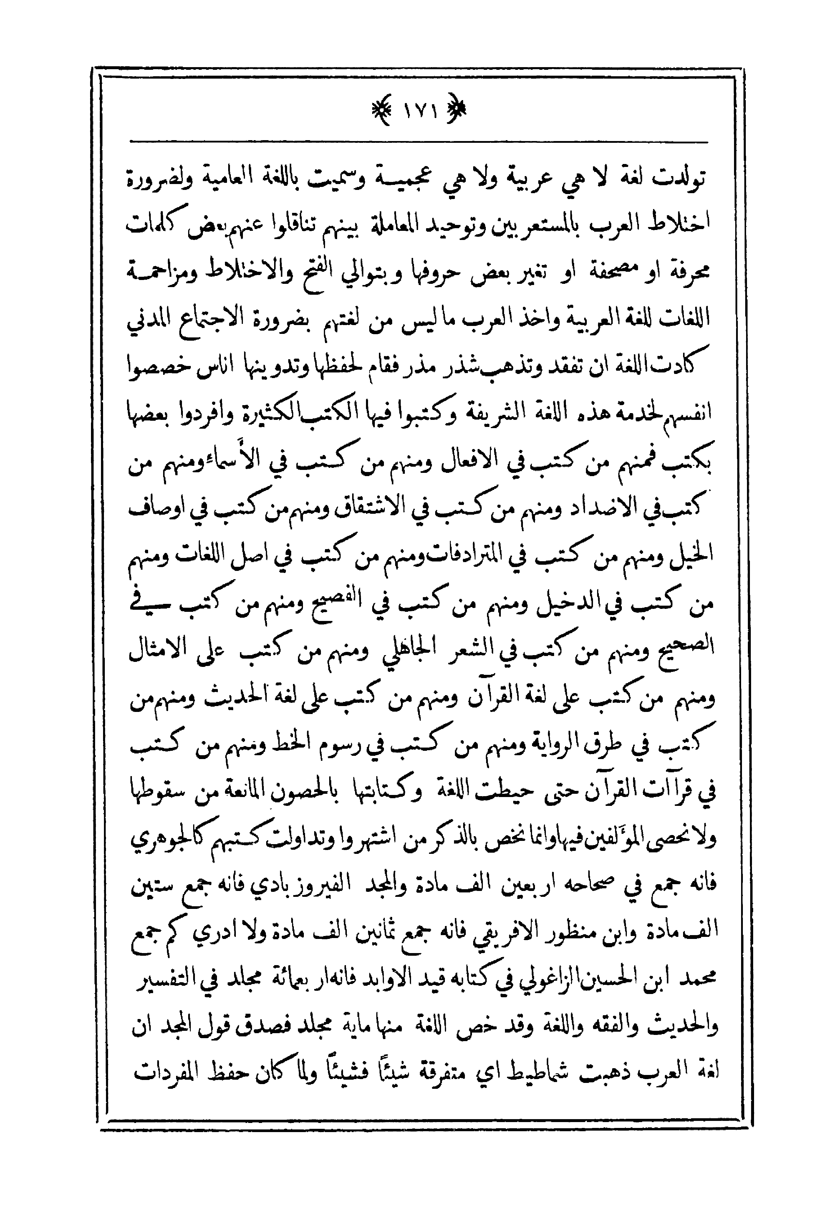تولدت لغة لا هي عربية ولا هي عجمية وسميت باللغة العامية ولضرورة اختلاط العرب بالمستعمرين وتوحيد المعاملة بينهم تناقلوا عنهم بعض كلمات محرفة أو مصحفة أو تغير بعض حروفها وبتوالي الفتح والاختلال ومزاحمة اللغات للغة العربية وأخذ العرب ما ليس من لغتهم بضرورة الاجتماع المدني كادت اللغة أن تفقد وتذهب شذر مذر فقام لحفظها وتدوينها أناس خصصوا أنفسهم لخدمة هذه اللغة الشريفة وكتبوا فيها الكتب الكثيرة وأفردوا بعضها بكتب فمنهم من كتب في الأفعال ومنهم من كتب في الأسماء ومنهم من كتب في الأضداد ومنهم من كتب في الاشتقاق ومنهم من كتب في أوصاف الخيل ومنهم من كتب في المترادفات ومنهم من كتب في أصل اللغات ومنهم من كتب في الدخيل ومنهم من كتب في الفصيح ومنهم من كتب في الصحيح ومنهم من كتب في الشعر الجاهلي ومنهم من كتب على أمثال ومنهم من كتب على لغة القرآن ومنهم من كتب على لغة الحديث ومنهم من كتب في طرق الرواية ومنهم من كتب في رسوم الخط ومنهم من كتب في قرآات القرآن حتى حيطت اللغة وكتابتها بالحصون المانعة من سقوطها ولا نحصى المؤلفين فيها وإنما نخص بالذكر من اشتهروا وتداولت كتبهم كالجوهري فإنه جمع في صحاصه أربعين ألف مادة والمجد الفيروز بادي فإنه جمع ستين ألاف مادة وابن منظور الأفريقي فإنه جمع ثمانين ألف مادة ولا أدري كم جمع محمد ابن الحسين الزاغولي في كتابه قيد الأوابد فإنه أربعمائة مجلد في التفسير والحديث والفقه واللغة وقد خص اللغة منها حكاية مجلد فصدق قول المجد أن لغة الغرب ذهبت شماطيط أي متفرقة شيئاً فشيئاً ولما كان حفظ المفردات