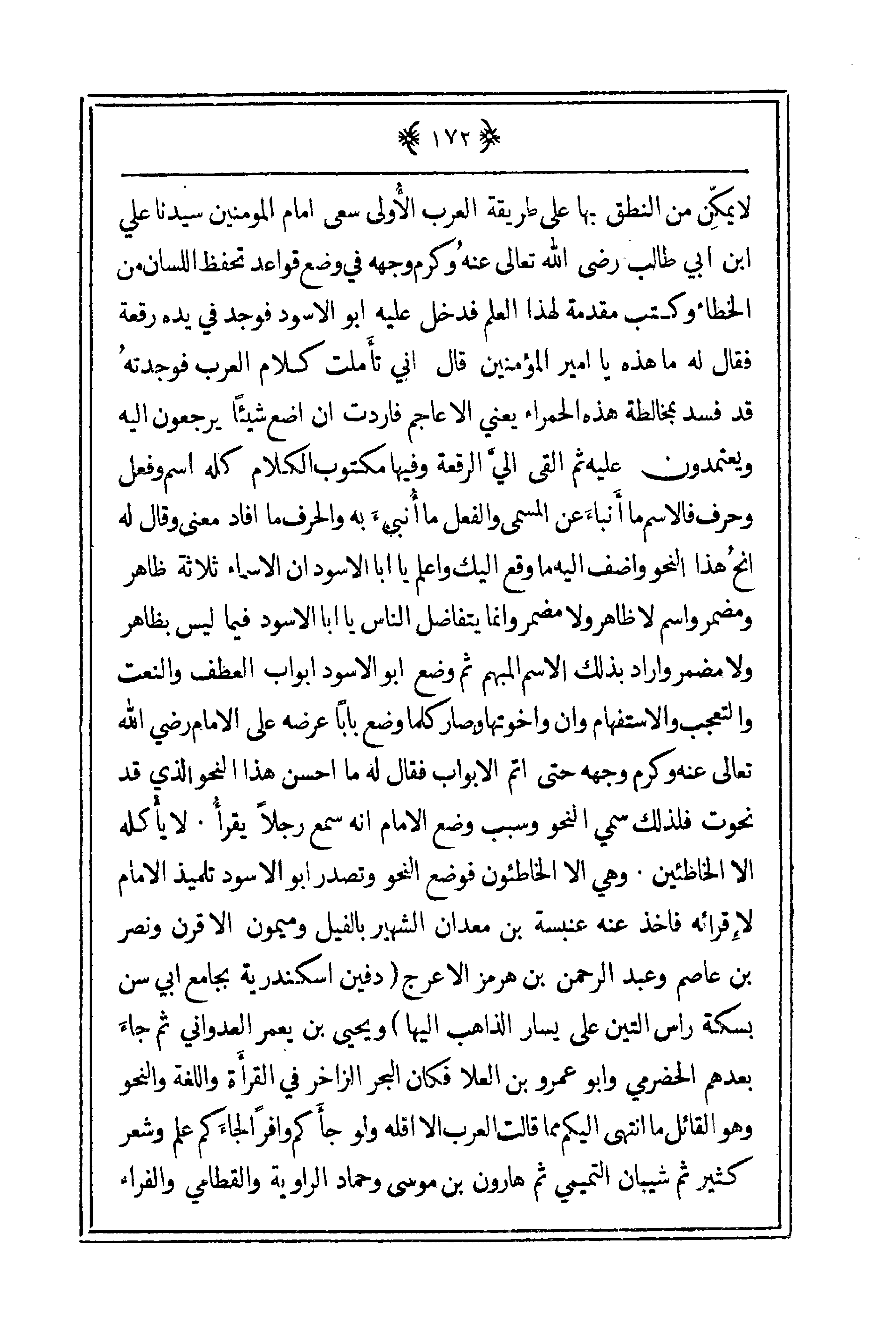 لا يمكن من النطق بها على طريقة العرب الأولى سعى إمام المؤمنين سيدنا علي أبن أبي طالب رضي الله تعالى عنه وكرم وجهه في وضع قواعد تحفظ اللسان من الخطأ وكتب مقدمة لهذا العلم فدخل عليه أبو الأسود فوجد في يده رقعة فقال له ما هذه يا أمير المؤمنين قال إني تأملت كلام العرب فوجدته قد فسد بمخالطة هذه الحمراء يعني الأعاجم فأدرت أن أضع شيئاًَ يرجعون إليه ويعتمدون عليه ثم ألقى إلي الرقعة وفيها مكتوب الكلام كله اسم وفعل وحرف فالاسم ما أنباء عن المسمى والفعل ما أنبئ به والحرف ما أفاد معنى وقال له انح هذا النحو و؟ أضف إليه ما وقع إليك