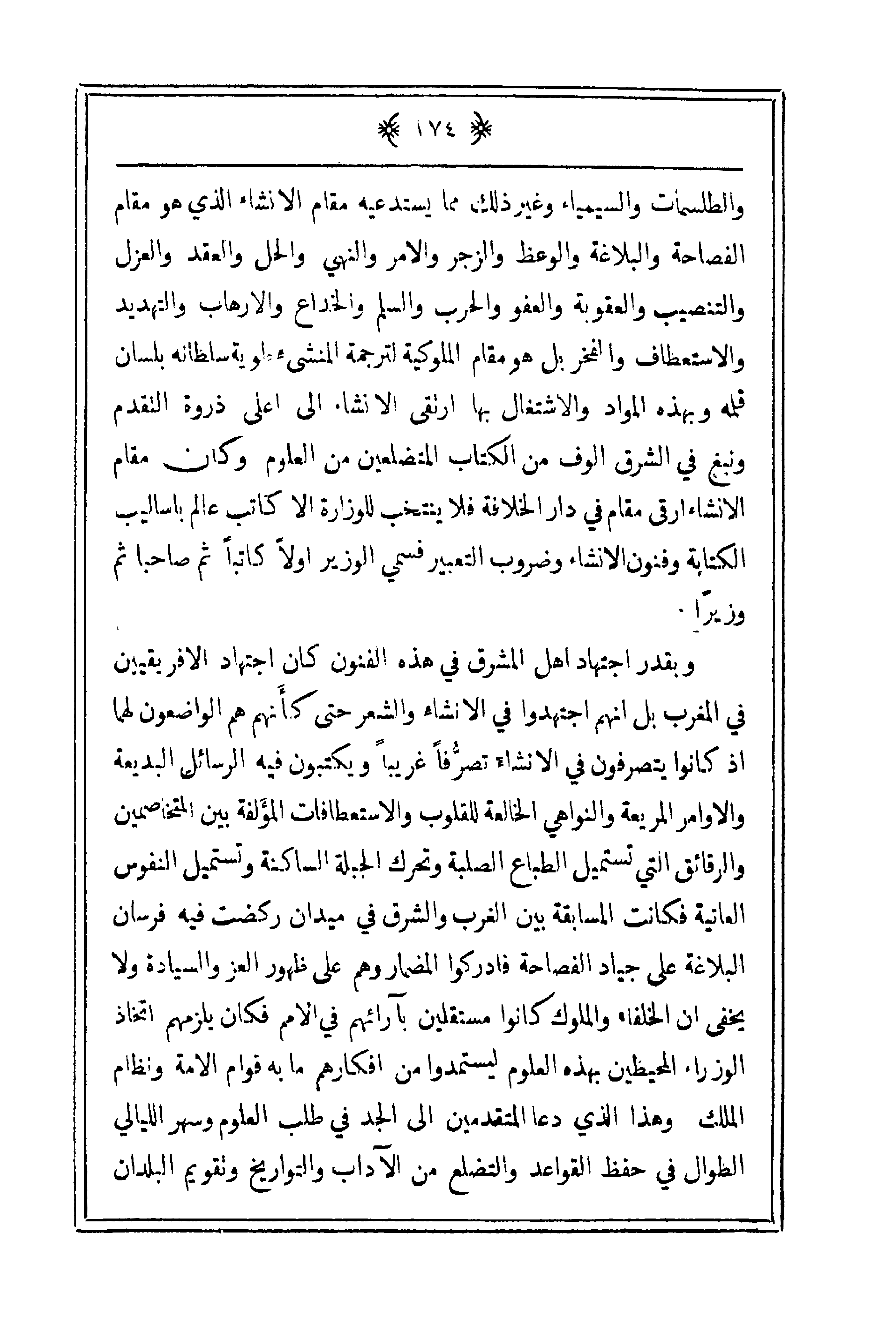 وبقدر اجتهاد أهل المشرق في هذه الفنون كان اجتهاد الأفريقيين في المغرب بل أنهم اجتهدوا في الإنشاء والشعر حتى كأنهم هم الواضعون لهما إذ كانوا يتصرفون في الإنشاء تصرفاً غريباً ويكتبون فيه الرسائل البديعة والأوامر المريعة والنواهي الخالعة للقلوب والاستعطافات المؤلفة بين المتخاصمين والرقائق التي تستميل الطباع الصلبة وتحرك الجبلة الساكنة وتستميل النفوس العاتية فكانت المسابقة بين الغرب والشرق في ميدان ركضت فيه فرسان البلاغة على جياد الفصاحة فأدركوا المضمار وهم على ظهور العز والسيادة ولا يخفى أن الخلفاء والملوك كانوا مستقلين بآرائهم في الأمم فكان يلزمهم اتخاذ الوزراء المحيطين بهذه العلوم ليستمدوا من أفكارهم ما به قوام الأمة ونظام الملك وهذا الذي دعا المتقدمين إلى الجد في طلب العلوم وسهر الليالي الطوال في حفظ القواعد والتضلع من الآداب والتواريخ وتقويم البلدان