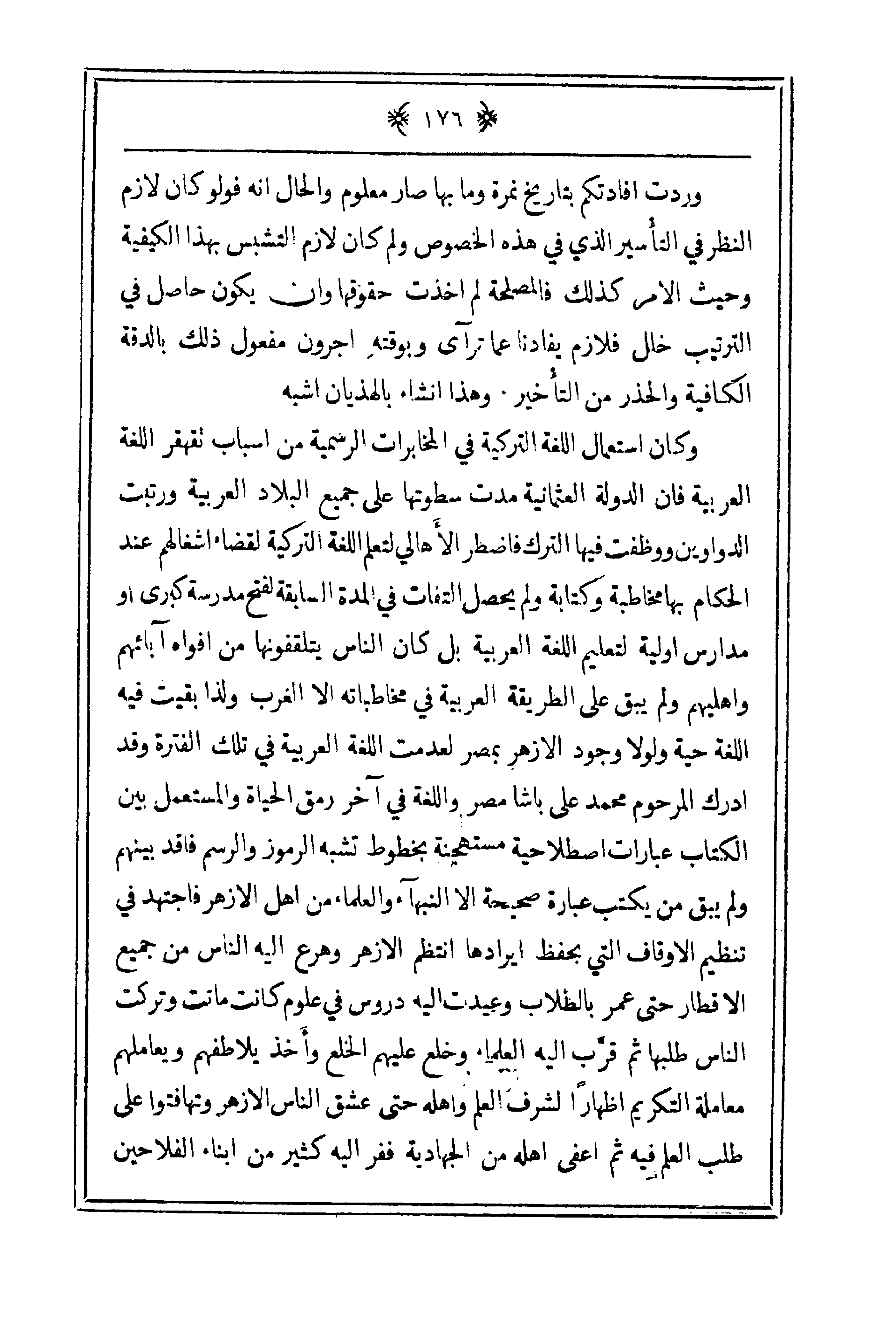 وكان استعمال اللغة التركية في المخابرات الرسمية من أسباب تقهقر اللغة العربية فإن الدولة العثمانية مدت سطوتها على جميع البلاد العربية ورتبت الدواوين ووظفت فيها الترك فاضطر الأهالي لتعلم اللغة التركية لقضاء أشغالهم عند الحكام بها مخاطبة وكتابة ولم يحصل التفات في المدة السابقة لفتح مدرسة كبرى أو مدارس أولية لتعليم اللغة العربية بل كان الناس يتلقفونها من أفواه آبائهم وأهليهم ولم يبق على الطريقة العربية في مخاطباته إلا الغرب ولذا بقيت فيه اللغة حية ولولا وجود الأزهر بمصر لعدمت اللغة العربية في تلك الفترة وقد أدرك المرحوم محمد علي باشا مصر واللغة في آخر رمق الحياة والمستعمل بين الكتاب عبارات اصطلاحية مستهجنة بخطوط تشبه الرموز والرسم فاقد بينهم ولم يبق من كتب عبارة صحيحة إلا النبهاء والعلماء من أهل الأزهر فاجتهد في تنظيم الأوقاف التي يحفظ إيرادها انتظم الأزهر وهرع إليه الناس من جميع الأقطار حتى عمر بالطلاب