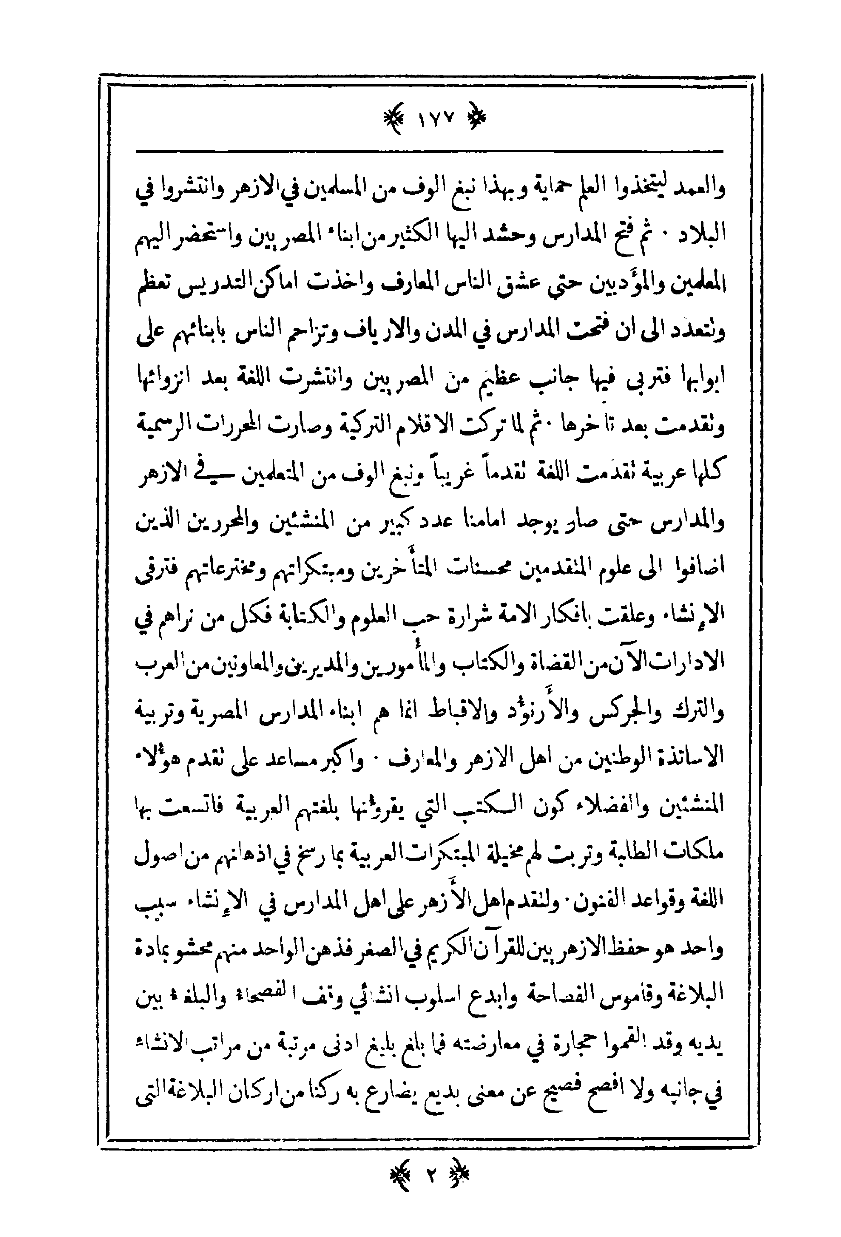 والعمد ليتخذوا العلم حماية وبهذا نبغ ألوف من المسلمين في الأزهر وانتشروا في البلاد. ثم فتح المدارس وحشد إليها الكثير من أبناء المصريين واستحضر إليهم المعلمين والمؤدبين حتى عشق الناس المعارف وأخذت أماكن التدريس تعظم وتتعدد إلى أن فتحت المدارس في المدن والأرياف وتزاحم الناس بأبنائهم على أبوابها فتربى فيها جانب عظيم من المصريين وانتشرت اللغة بعد انزوائها وتقدمت بعد تأخرها. ثم لما تركت الأفلام التركية وصارت المحررات الرسمية كلها عربية تقدمت اللغة تقدماً غريباً ونبغ ألوف من المتعلمين في الأزهر والمدارس حتى صار يوجد أمامنا عدد كبير من المنشئين والمحررين الذين أضافوا إلى علوم المتقدمين محسنات المتأخرين ومبتكراتهم ومخترعاتهم فترقى الإنشاء وعلقت بأفكار الأمة شرارة حب العلوم والكتابة فكل من نراعهم في الإدارات الآن من القضاة والكتاب والمأمورين والمديرين والمعاونين من العرب والترك والجركس والأرنؤد والأقباط إنما هم أبناء المدارس المصرية وتربية الأساتذة الوطنيين من أهل الأزهر والمعارف. وأكبر مساعد على تقدم هؤلاء المنشئين والفضلاء كون الكتب التي يقرؤونها بلغتهم العربية فاتسعت بها ملكات الطلبة وتربت لهم مخيلة المبتكرات العربية بما رسخ في أذهانهم من أصول اللغة وقواعد الفنون. ولتقدم أهل الأزهر على أهل المدارس في الإنشاء سبب واحد هو حفظ الأزهريين للقرآن الكريم في الصغر فذهن الواحد منهم محشو بمادة البلاغة وقاموس الفصاحة وأبدع أسلوب إنشائي وقف الفصحاء والبلغاء بين يديه وقد ألقموا حجارة في معارضته فلما بلغ بليغ أدنى مرتبة من مراتب الإنشاء في جانبه ولا أفصح فصيح عن معنى بديع يضارع به ركناً من أركان البلاغة التي
