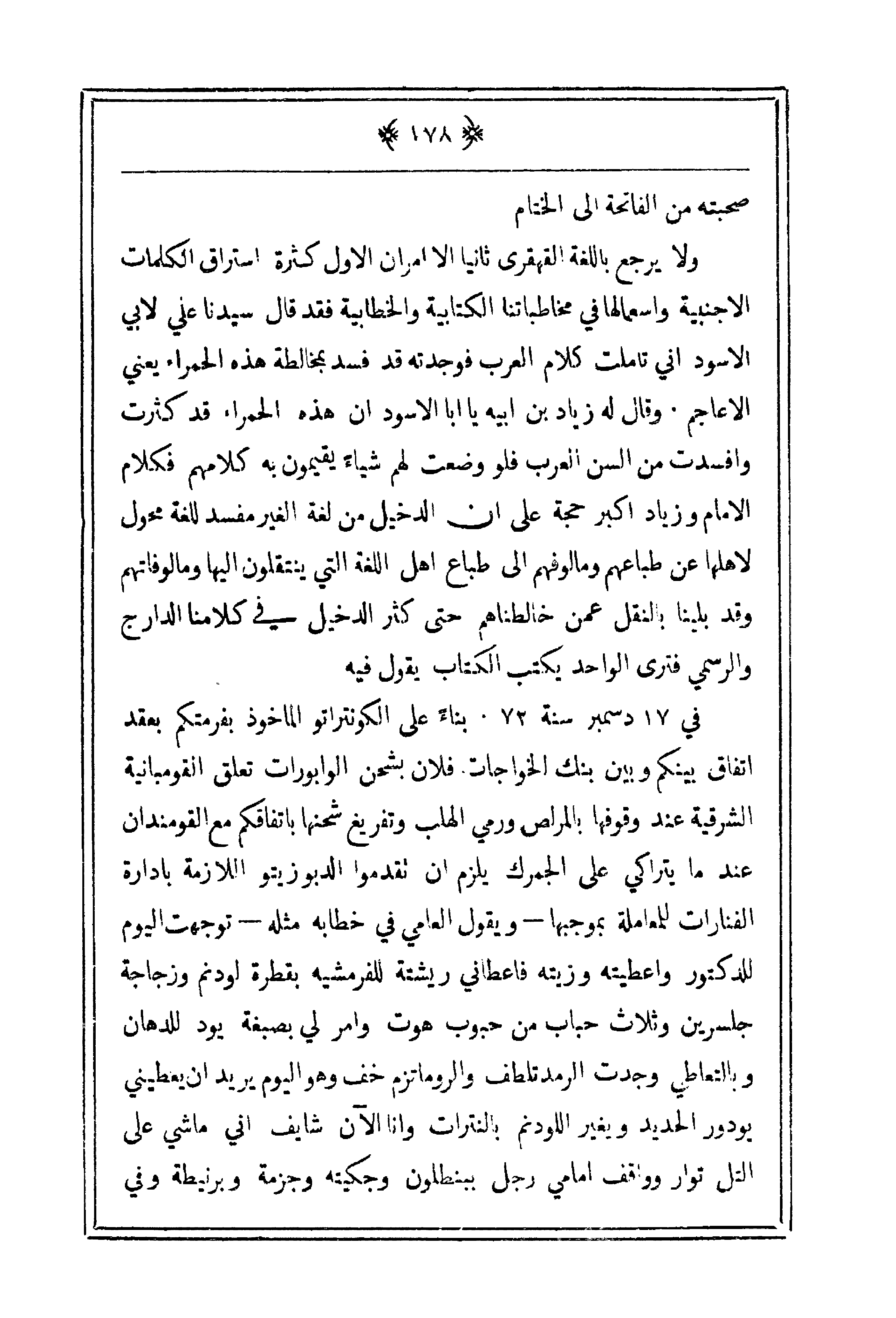 في 17 ديسمبر سنة 72، بناء على الكونتراتو المأخوذ بفرمتكم بعقد اتفاق بينكم وبين بنك الخواجات فلان بشحن الوابورات تعلق القومبانية الشرقية عند وقوفها بالمرلص ورمي الهلب وتفريغ شحنها باتفاقكم مع القومندان عند ما يتراكب على الجمرك يلزم أن تقدموا الدبوزيتو اللازمة بإدارة الفنارات للمعاملة بموجبها ـ ويقول العامي في خطابه مثله ـ توجهت اليوم للدكتور وأعطيته وزيته فأعطاني ريشته للفرمشية بقطرة لودنم وزجاجة جلسرين وثلاث حباب من حبوب هوت وأمر لي بصبغة يود للدهان وبالتعاطي وجدت الرمد تلطف والروماتزم خف وهو اليوم يريد أن يعطيني يودور الحديد ويغير اللودنم بالنترات وأنا الآن شايف أني ماشي على التل توار وواقف أمامي رجل ببنطلون وجكيته وجزمة وبرنيطة وفي