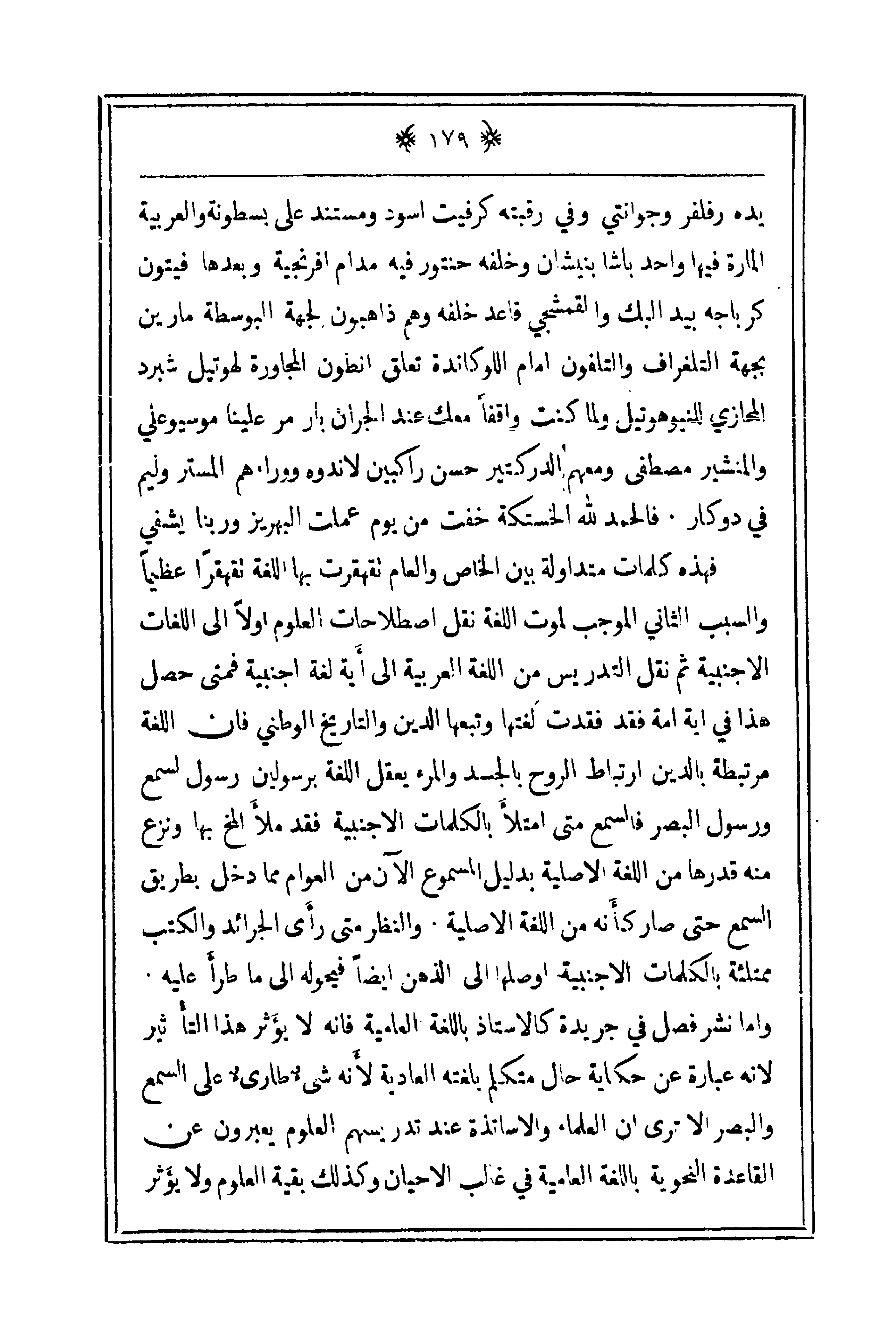 فهذه كلمات متداولة بين الخاص والعام تقهقرت بها اللغة تقهقراً عظيماً والسبب الثاني الموجب ملون اللغة نقل اصطلاحات العلوم أولاً إلى اللغات الأجنبية ثم نقل التدريس من اللغة العربية إلى أية لغة أجنبية فمتى حصل هذا في أية أمة فقد فقدت لغتها وتبعها الدين والتاريخ الوطني فإن اللغة مرتبطة بالدين ارتباط الروح بالجسد والمرء يعقل اللغة برسولين رسول لسمع ورسول البصر فالسمع متى امتلأ بالكلمات الأجنبية فقد ملأ المخ بها