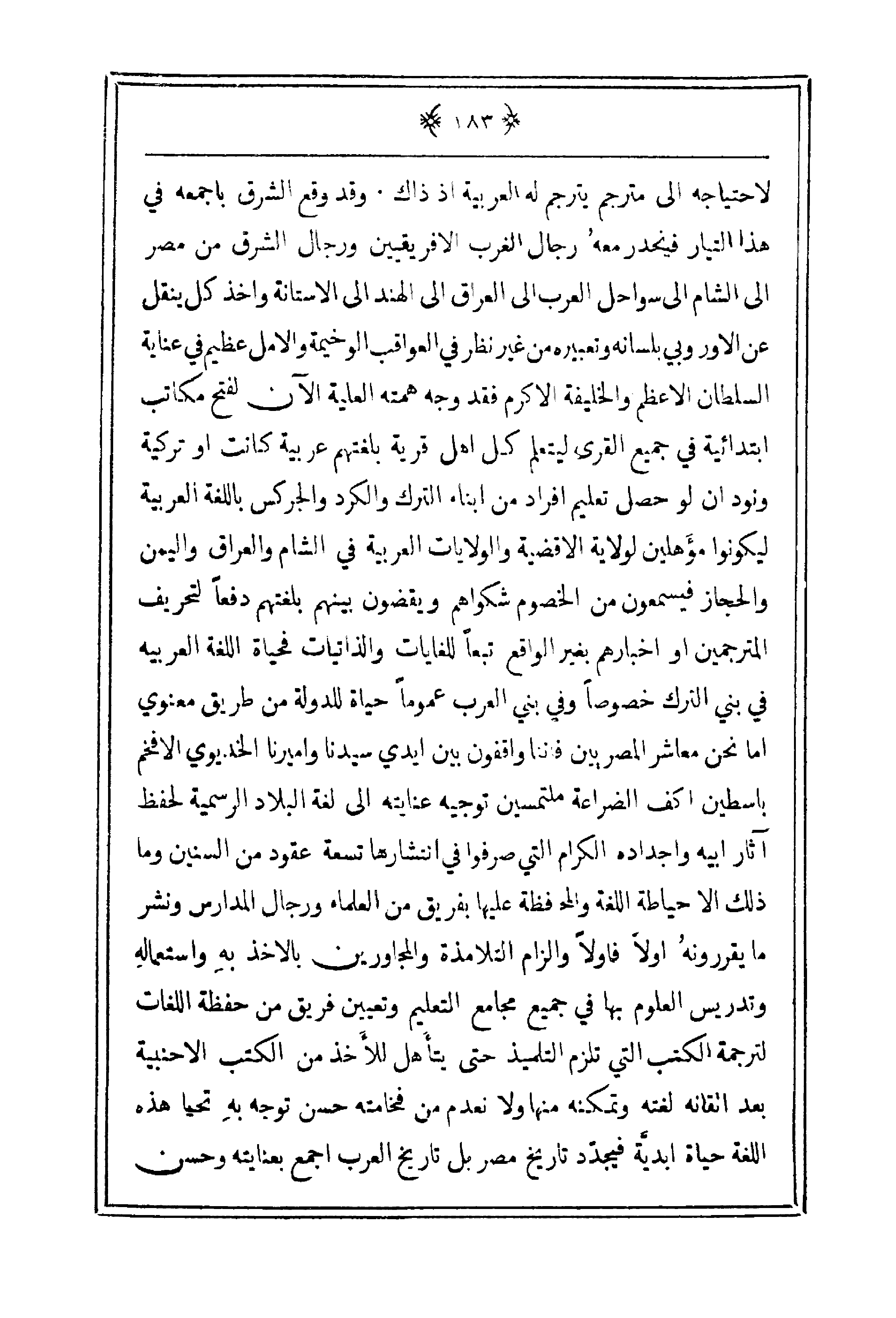 لاحتياجه إلى مترجم يترجم له العربية إذ ذاك. وقد وقع الشرق بأجمعه في هذا التيار فينحدر معه رجال الغرب الأفريقيين ورجال الشرق من مصر إلى الشام إلى سواحل العرب إلى العراق إلى الهند إلى الأستانة وأخذ كل ينقل عن الأوروبي بلسانه وتعبيره من غير نظر في العواقب الوخيمة والأمل عظيم في عناية السلطان الأعظم والخليفة الأكرم فقد وجه همته العلية الآن لفتح مكاتب ابتدائية في جميع القرى ليتعلم كل أهل قرية بلغتهم عربية كانت أو تركية ونود أن لو حصل تعليم أفراد من أبناء الترك والكرد والجركس باللغة العربية ليكونوا مؤهلين لولاية الأقضية والولايات العربية في الشام والعراق واليمن والحجاز فيسمعون من الخصوم شكواهم ومقضون بينهم بلغتهم دفعاً لتحريف المترجمين أو أخبارهم بغير الواقع تبعاً للغايات والذتيات فحياة اللغة العربية في بني الترك خصوصاً وفي بنيا لعرب عموماً حياة للدولة من طريق معنوي أما نحن معاشر المصريين فإننا واقفون بين أيدي سيدنا وأميرنا الخديوي الأفخم باسطين أكف الضراعة ملتمسين توجيه عنايته إلى لغة البلاد الرسمية لحفظ آثار أبيه وأجداده الكرام التي صرفوا في انتشارها تسعة عقود من السنين وما ذلك إلا حياكة اللغة والمحافظة عليها بفريق من العلماء ورجال المدارس ونشر ما يقررونه أولاً فأولاً وإلزام التلامذة والمجاورين بالأخذ به واستعماله وتدريس العلوم بها في جميع مجامع التعليم وتعيين فريق من حفظة اللغات لترجمة الكتب التي تلزم التلميذ حتى يتأهل للأخذ من الكتب الأجنبية بعد إتقانه لغته وتمكنه منهل ولا نعدم من فخامته حسن توجه به تحيا هذه اللغة حياة أبدية فيجدد تاريخ مصر بل تاريخ العرب أجمع بعنايته وحسن