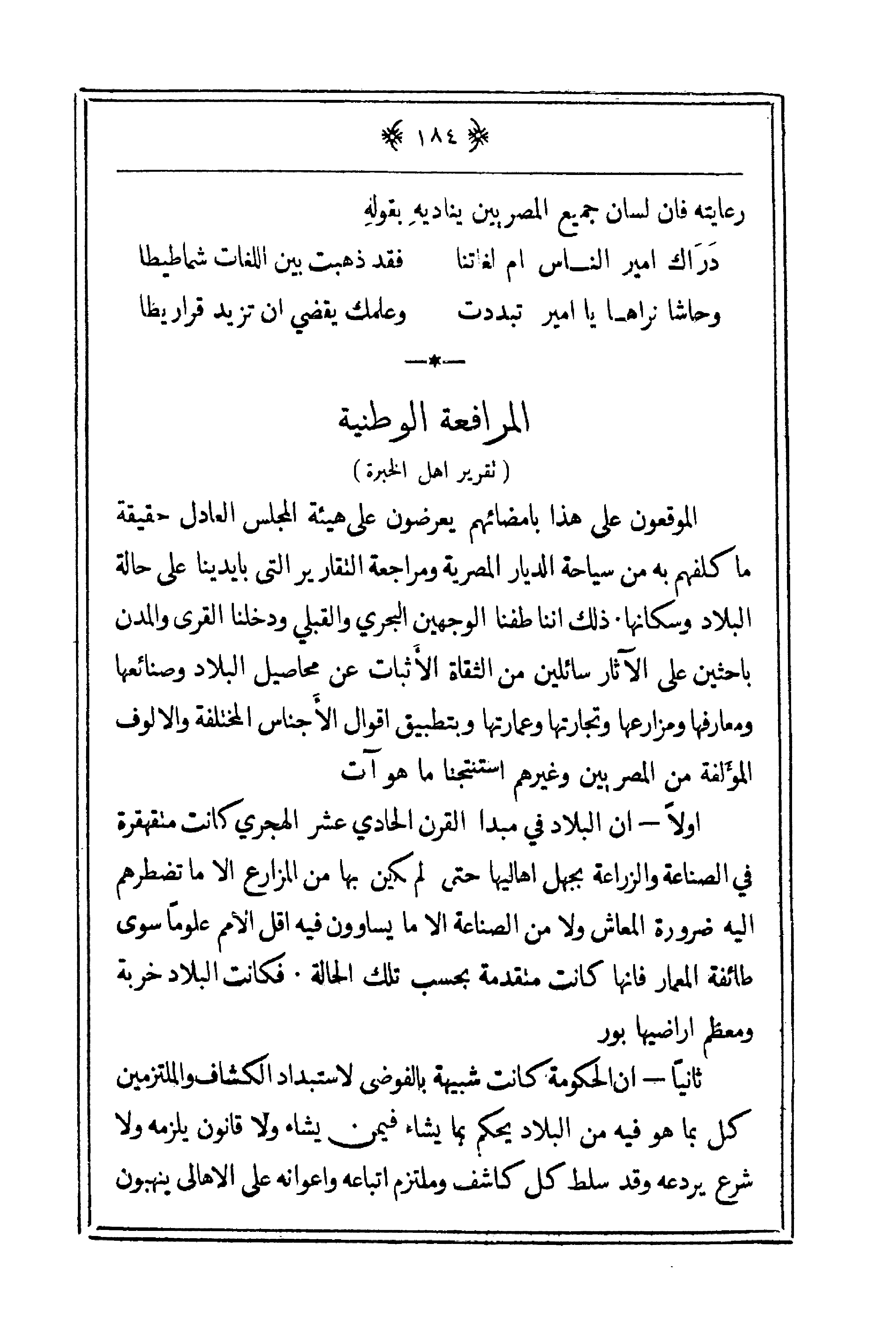 الموقعون على هذا بإمضائهم يعرضون على هيئة المجلس العادل حقيقة ما كلفهم به من سياحة الديار المصرية ومراجعة التقارير التي بأيدينا على حالة البلاد وسكانها ذلك إننا طفنا الوجهين البحري والقبلي ودخلنا القرى والمدن باحثين على الآثار سائلين من الثقاة الإثبات عن مصايل البلاد وصنائعها ومعارفها ومزارعها وتجارتها وعمارتها وبتطبيق أقوال الأجناس المختلفة والألوف المؤلفة من المصريين وغيرهم استنتجنا ما هو آت.