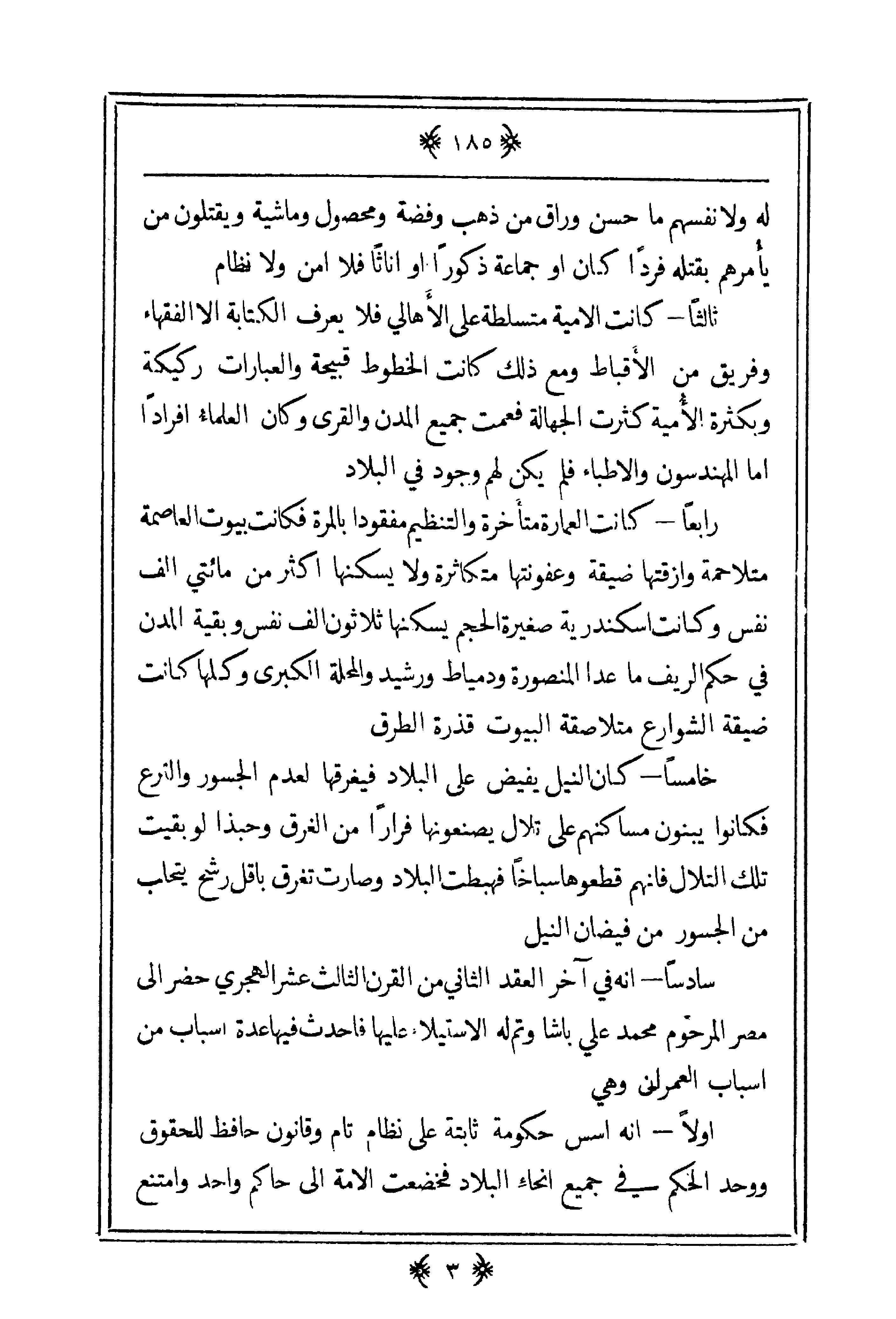 سادساً: أنه في آخر العقد الثاني من القرن الثالث عشر الهجري حضر إلى مصر المرحوم محمد علي باشا وتم له الاستيلاء عليها فأحدث فيها عدة أسباب من أسباب العمران وهي: