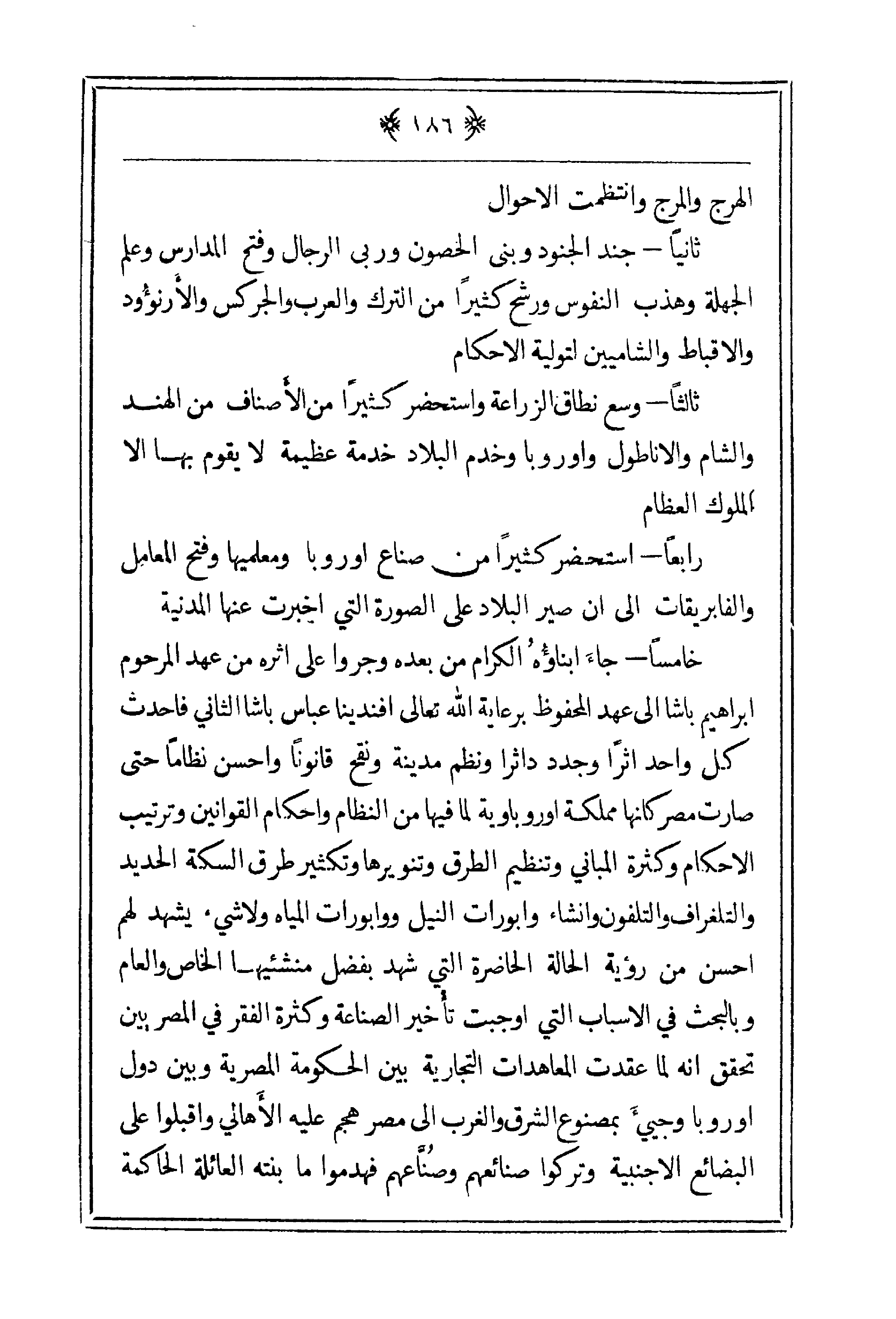 خامساً: جاء أبناؤه الكرام من بعده وجروا على أثره من عهد المرحوم إبراهيم باشا إلى عهد المحفوظ برعاية الله تعالى أفندينا عباس باشا الثاني فأحدث كل واحد أثراُ وجدد داثراً ونظم مدينة ونقح قانوناً وأحسن نظاماً حتى صارت مصر كأنها مملكة أوروباوية لما فيها من النظام وأحكام القوانين وترتيب الأحكام وكثرة المباني وتنظيم الطرق وتنويرها وتكثير طرق السكة الحديد والتلغراف والتلفون وإنشاء وأبورات النيل ووابورات المياه ولا شيء يشهد لهم أحسن من رؤية الحالة الحاضرة التي شهد بفضل منشئيها الخاص والعام وبالبحث في الأسباب التي أوجبت تأخير الصناعة كثرة الفقر في المصريين تحقق إنه لما عقدت المعاهدات التجارية بين الحكومة المصرية وبين دول أوروبا وجيء بمصنوع الشرق والغرب إلى مصر هجم عليه الأهالي وأقبلوا على البضائع الأجنبية وتركوا صنائعهم وصناعهم فهدموا ما بنته العائلة الحاكمة