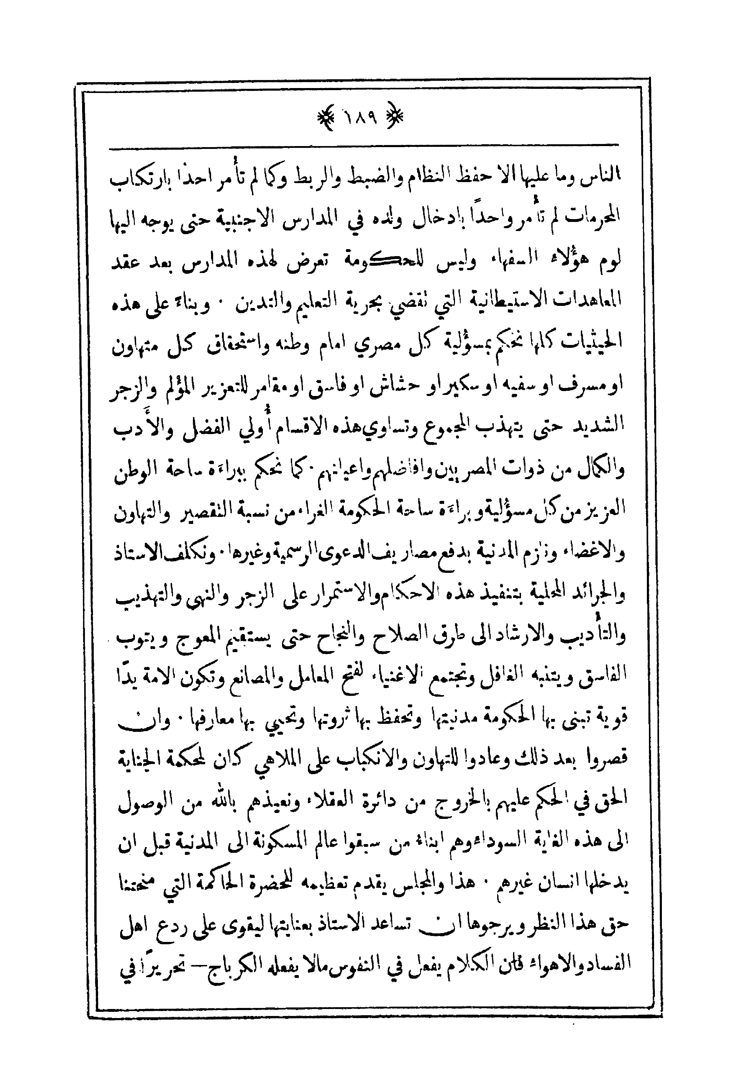 الناس وما عليها إلا حفظ النظام والضبط والربط وكما لم تأمر أحداً بارتكاب المحرمات لم تأمر واحداً بإدخال ولده في المدارس الأجنبية حتى يوجه إليها لوم هؤلاء السفهاء وليس للحكومة تعرض لهذه المدارس بعد عقد المعاهدات الاستيطانية التي تقضي بحرية التعليم والتدين. وبناء على هذه الحيثيات كلها نحكم بمسؤولية كل مصري أمام وطنه واستحقاق كل متهاون أو مسرف أو سفيه أو سكير أو حشاش أو فاسق أو مقامر للتعزير المؤلم والزجر الشديد حتى يتهذب المجموع وتساوي هذه الأقسام أولي الفضل والأدب والكمال من ذوات المصريين وأفاضلهم وأعيانهم. كما نحكم ببراءة ساحة الوطن العزيز من كل مسؤولية وبراءة ساحة الحكومة الغراء من نسبة التقصير والتهاون والإغضاء وتلزم المدينة بدفع مصاريف الدعوى الرسمية وغيرها ونكلف الأستاذ والجرائد المحلية بتنفيذ هذ1هـ الأحكام والاستمرار على الزجر والنهي والتهذيب والتأديب والإرشاد إلى طرق الصالح والنجاح حتى يستقيم المعوج ويتوب الفاسق ويتنبه الغافل وتجمعه الأغنياء لفتح المعامل والمصانع وتكون الأمة يداً قوية تبنى بها الحكومة مدينتها وتحفظ بها ثروتها وتحيي بها معارفها. وإن قصروا بعد ذلك وعادوا للتهاون والانكباب على الملاهي كان لمحكمة الجناية الحق في الحكم عليهم بالخروج من دائرة العقلاء ونعيذهم بالله من الوصول إلى هذه الغاية السوداء وهم أبناء من سبقوا عالم المسكونة إلى المدينة قبل أن يدخلها إنسان غيرهم. هذا والمجلس يقدم تعظيمة للحضرة الحاكمة التي منحتنا حق هذا النظر ويرجوها أن تساعد الأستاذ بعنايتها ليقوى على ردع أهل الفساد والأهواء فإن الكلام يفعل في النفوس ما لا يفعله الكرباج ـ تحريراً في
