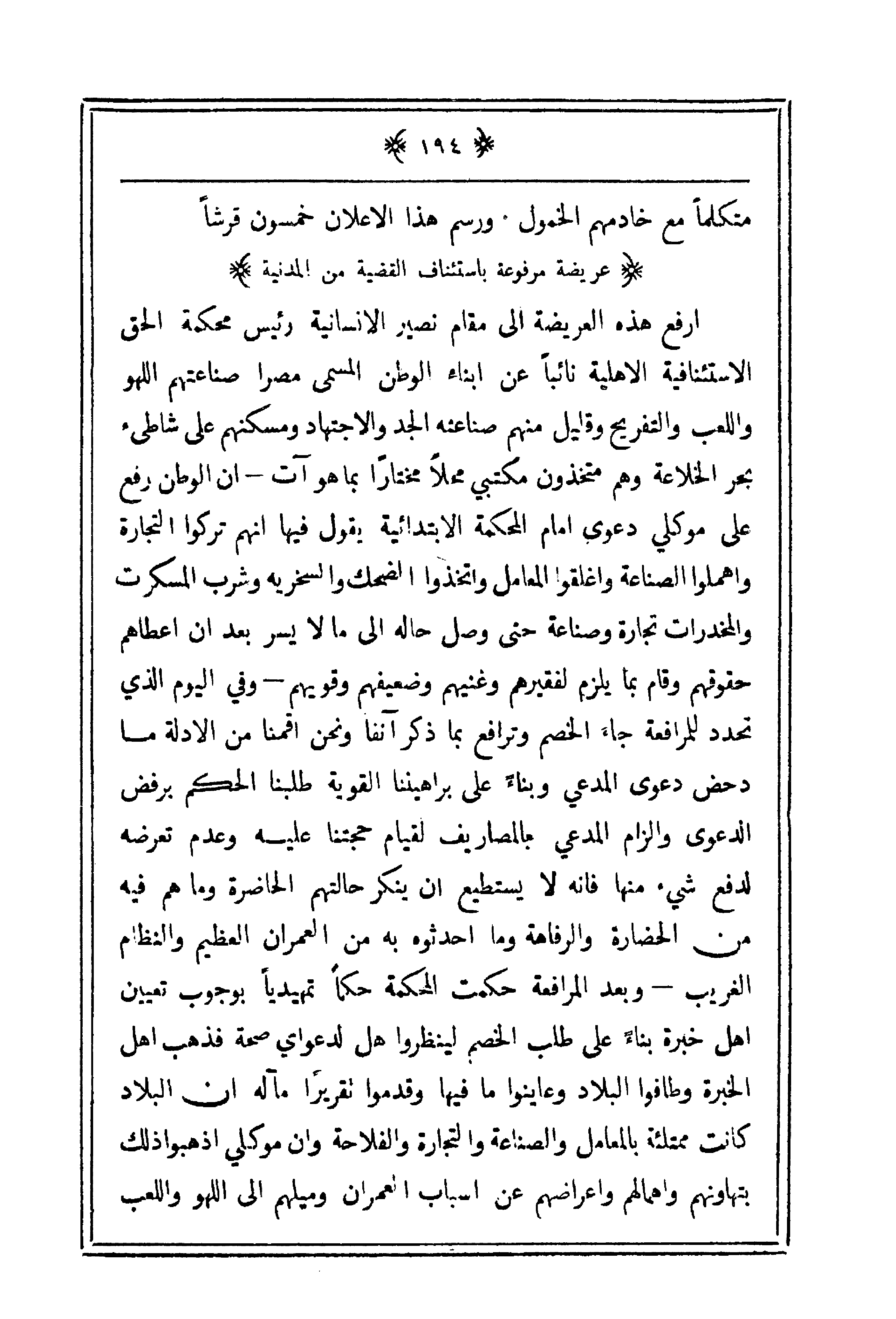أرفع هذه العريضة إلى مقام نصري الإنسانية رئسي محكمة الحق الاستئنافية الأهلية نائباً عن أبناء الوطن المسمى مصراً صناعتهم اللهو واللعب والتفريح وقليل منهم صناعته الحد والاجتهاد ومسكنهم على شاطئ بحر الخلاعة وهم متخذون مكتبي محلاً مختاراً بما هو آت ـ أن الوطن رفع على موكلي دعوى أمام المحكمة الابتدائية يقول فيها أنهم تركوا التجارة وأهملوا الصناعة وأغلقوا المعامل واتخذوا الضحك والسخرية وشرب المسكرات والمخدرات تجارة وصناعة حتى وصل حاله إلى ما لا يسر بعد أن أعطاهم حقوقهم وقام بما يلزم لفقيرهم وغنيهم وضعيفهم وقويهم ـ وفي اليوم الذي تحدد للمرافعة جاء الخصم وترافع بما ذكر آنفاً ونحن أقمنا من الأدلة ما دحض دعوى المدعي وبناء على براهيننا القوية طلبنا الحكم برفض الدعوى وإلزام المدعي بالمصاريف لقيام حجتنا عليه وعدم تعرضه لدفع شيء منها فإنه لا يستطيع أن ينكر حالتهم الحاضرة وما هم فيه من الحضارة والرفاه وما أحدثوه به من العمران العظيم والنظام الغريب ـ وبعد المرافعة حكمت المحكمة حكاً تمهيدياً بوجوب تعيين أهل الخبرة بناء على طلب الخصم لينظروا هل لدعواي صحة فذهب أهل الخبرة وطالوا البلاد وعاينوا ما فيها وقدموا تقريراً مآله أن البلاد كانت ممتلئة