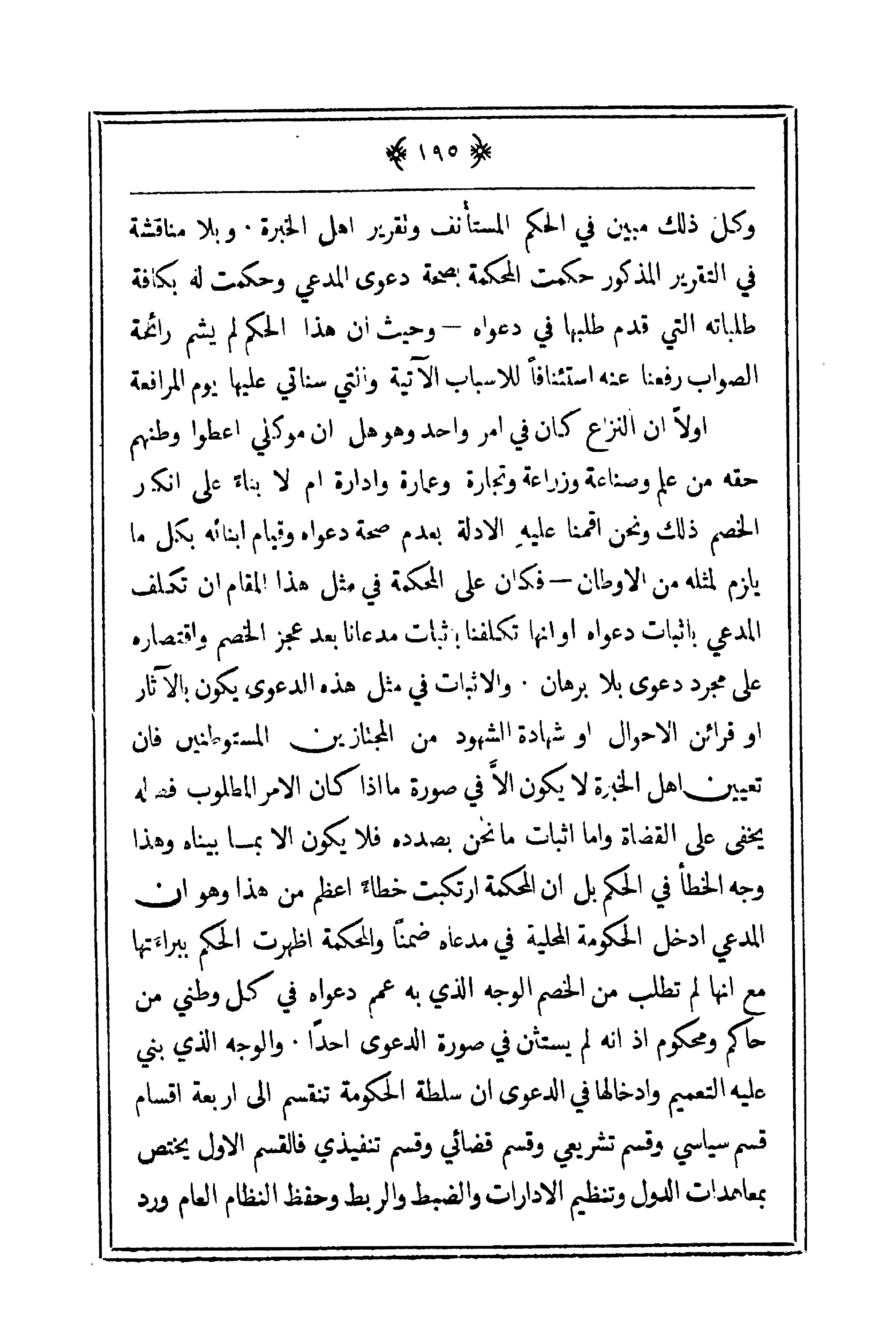 أولاً ـ أن النزاع كان في أمر واحد وهو هل أن موكلي أعطوا وطنهم حقه من علم وصناعة وزراعة وتجارة وعمارة وإدارة أمز لا بناء على إنكار الخصم ذلك ونحن أقمنا عليه الأدلة بعدم صحة دعواه وقيام أبنائه بكل ما يلزم لمثله من الأوطان ـ فكان على المحكمة في مثل هذا المقام أن تكلف المدعي بإثبات دعواه أو أنها تكلفنا بإثبات مدعانا بعد عجز الخصم واقتصاره على مجرد دعوى بلا رهان. والإثبات في مثل هذه الدعوى يكون بالآثار أو قارئ الأخوان أو شهادة الشهود من المجتازين المستوطنين فإن تعيين أهل الخبرة لا يكون إلا في صورة ما إذا كان الأمر المطلوب فصله يخفى على القضاة وأما إثبات ما نحن بصدده فلا يكون إلا بما بيناه وهذا وجه الخطأ في الحكم بل أن المحكمة ارتكبت خطاء أعظم من هذا وهو أآن المدعي أجل الحكومة المحلية في مدعاه ضمناً والمحكمة أظهرت الحكم ببراءتها مع أنها لم تطلب من الخصم الوجه الذي به عمم دعواه في كل وطني من حاكم ومحكوم إذا أنه لم يستثن ف صورة الدعوى أحداً. والوجه الذي بني عليه التعميم وإدخالها في الدعوى أن سلطة الحكومة تنقسم إلى أربعة أقسام قسم سياسي وقسم تشريعي وقسم قضائي وقسم تنفيذي فالقسم الأول يختص بمعاهدات الدول وتنظيم الإدارات والضبط والربط وحفظ النظام العام ورد
