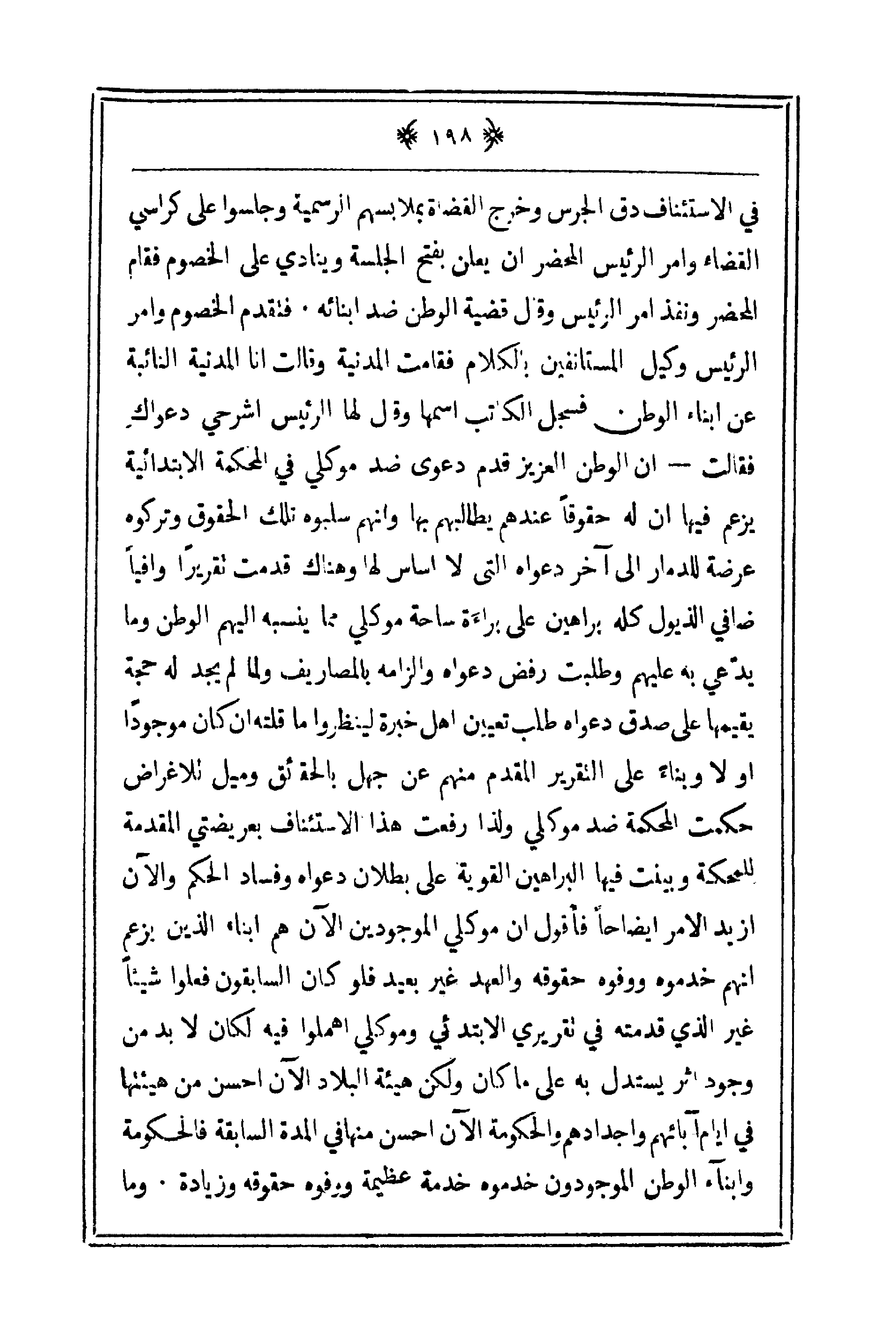 في الاستئناف دق الجرس وخرج القضاة بملابسهم السمية وجلسوا على كراسي القضاء وأمر الرئيس المحضر أن يعلن بفتح الجلسة وينادي على الخصوم فقام المحضر ونفذ أمر الرئيس وقال قضية الوطن ضد أبنائه. فتقدم الخصوم وأمر الرئيس وكيل المستأنفين بالكلام فقامت المدينة وقالت أنا المدينة النائبة عن ـبناء الوطن فسجل الكاتب اسمها وقال لها الرئيس اشرحي دعواك فقالت ـ أن الوطن العزيز قدم دعوى ضد موكلي في المحكمة الابتدائية يزعم فيها أن له حقوقاً عندهم يطالبهم بما وأنههم سلبوه تلك الحقوق وتركوه عرضة للدمار إلى آخر دعواه التي لا أساس لها وهناك قدمت تقريراً وافياً ضافي الذيول كله براهين على براءة ساحة موكلي مما ينسبه إليهم الوطن وما يدعي به عليهم وطلبت رفض دعواه وإلزامه بالمصاريف ولما لم يجدل له حجة يقيمها على صدق دعواه طلب تعيين أهل خبرة لينظروا ما قلته أن كان موجوداً أو لا وبناء على التقرير المقدم منهم على جهل بالحقائق وميل للأغراض حكمت المحكمة ضد موكلي ولذا رفعت هذا الاستئناف بعريضتي المقدمة للمحكمة وبين فيها البراهين القوية على بطلان دعواه وفساد الحكم والآن أزيد الأمر إيضاحاً فأقول أن موكلي الموجودين الآن هم أبناء الذين يزعم أنهم خدموه ووفوه حقوقه والعهد غير بعيد فلو كان السابقون فعلوا شيئاً غير الذي قدمته في تقرير الابتدائي وموكلي أهملوا فيه لكان لا بد من وجود أثر يستدل به على ما كان ولكن هيئة البلاد الآن أحسن من هيئتها في أيام آبائهم وأجدادهم والحكومة الآن أحسن منها في المدى السابقة فالحكومة وأبناء الوطن الموجودين خدموه خدمة عظيمة ووفوه حقوقه وزيادة. وما